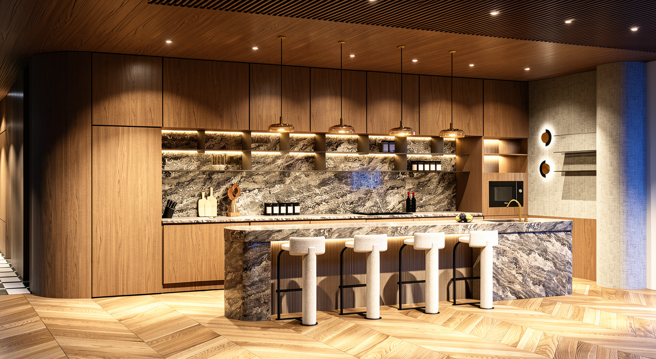 enhance into photo realistic view interior with soft lighting maintain the interior material elements and color