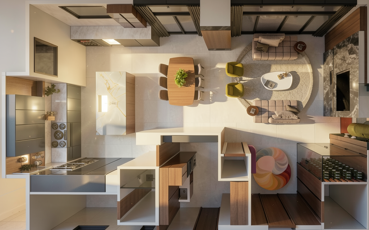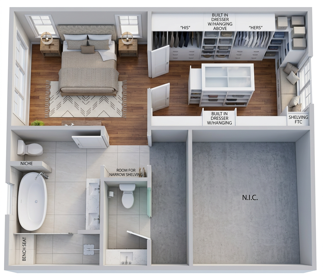 convert this floor plan into a realistic isometric 3d view of a full house show the space from an elevated angle with furniture walls and details visible keep exact image but remove windows behind bed use the same furniture as shows on the plan do not change the orientation of the floorplan