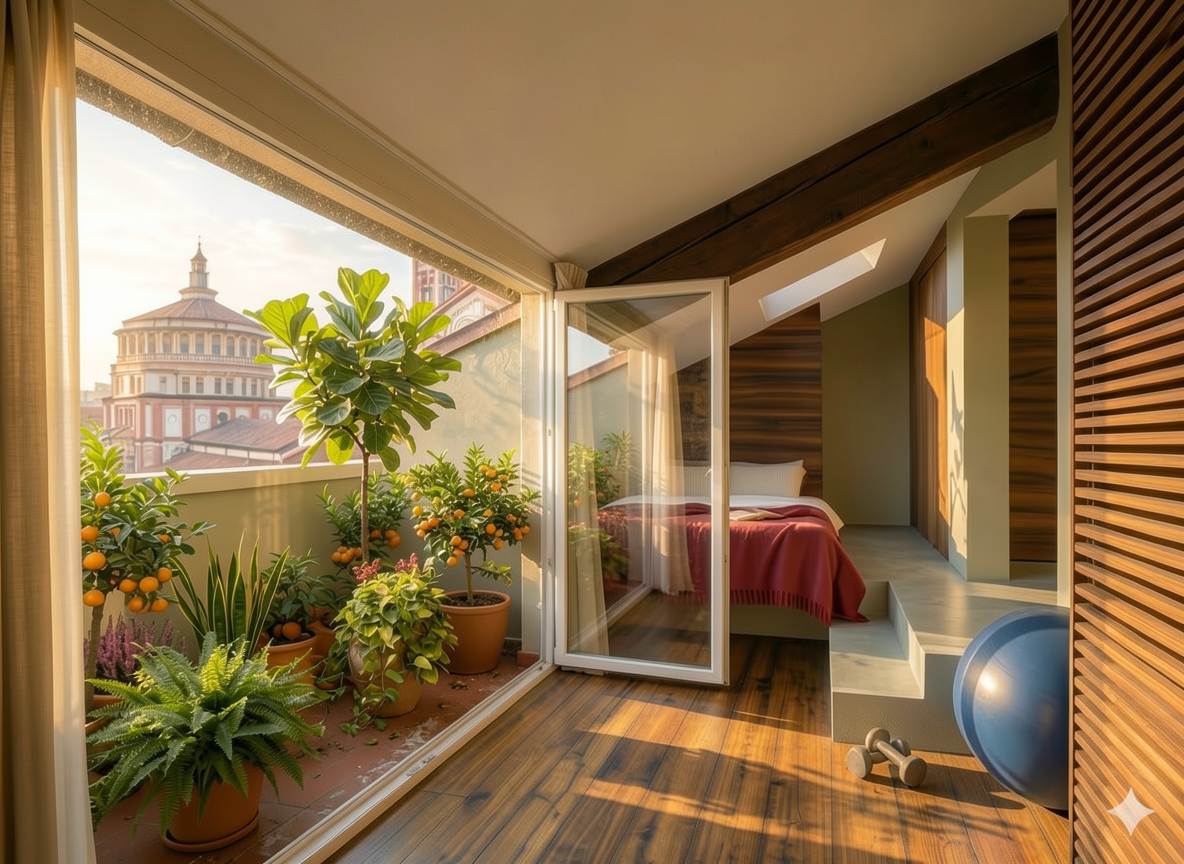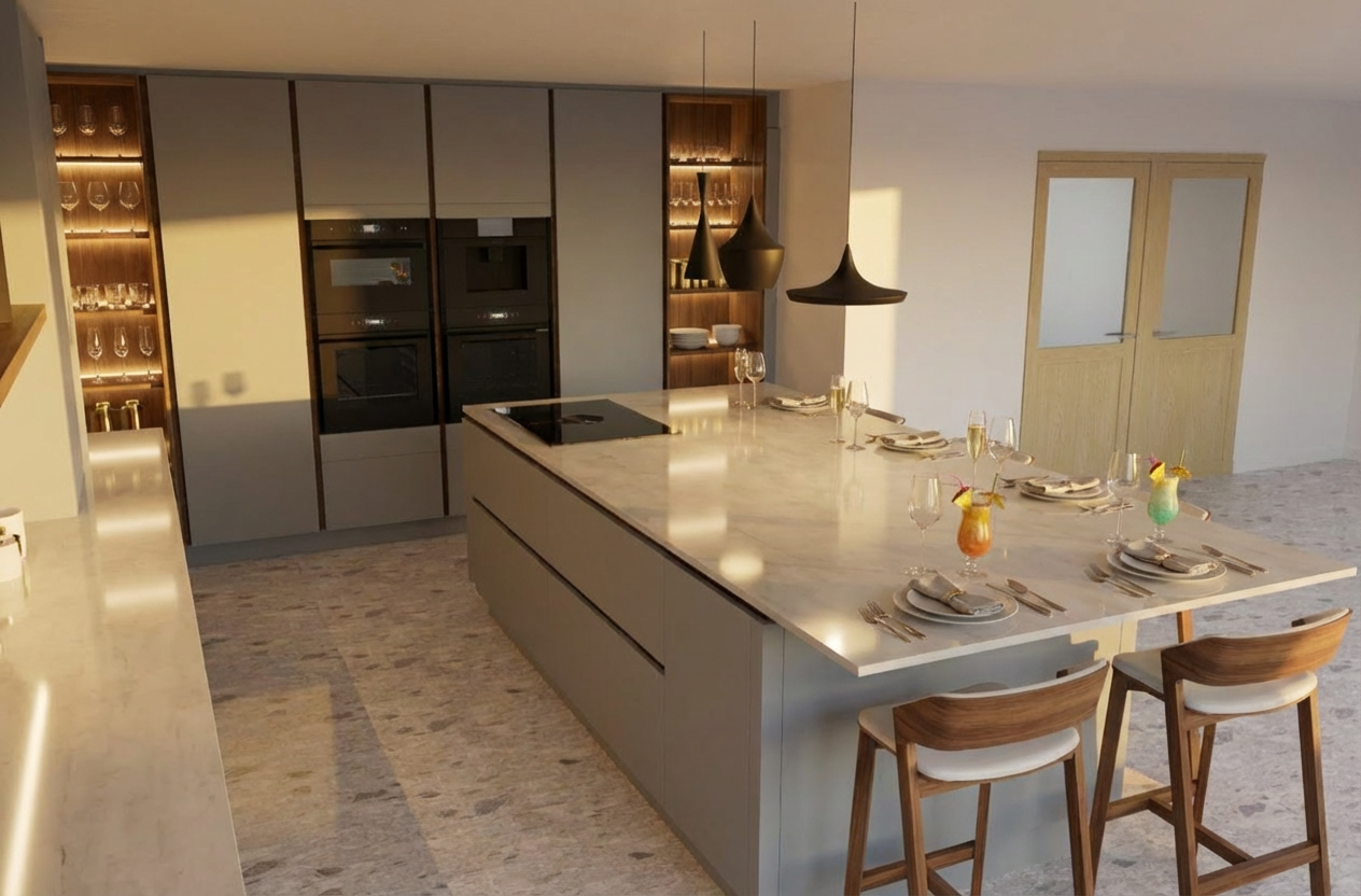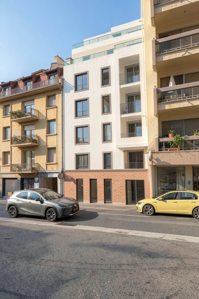 modernist exterior shot please make an architectural render of this image do not change the perspective and aspect ratio make setting on a mountain with a with a subtle sunrise scene and add a subtly misty horizon please make the view city view purple skies and heading night scene architecture