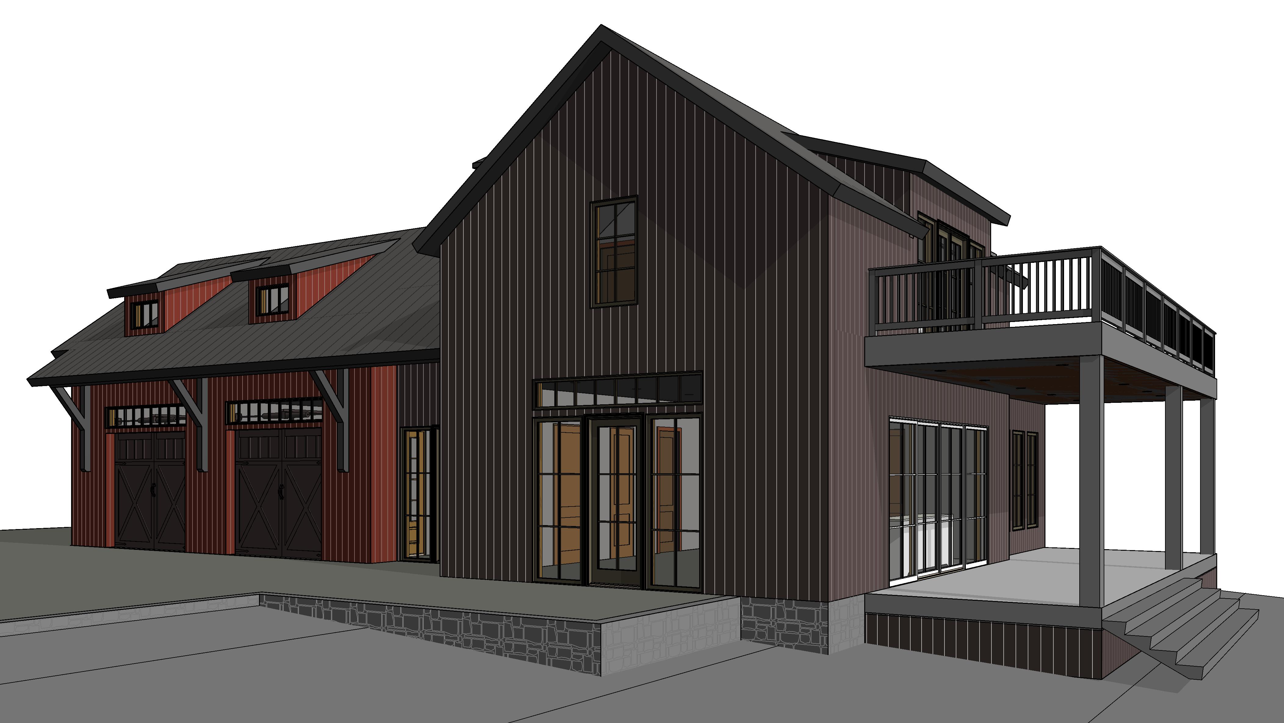 do not change the building shape or details use red vertical wood strip siding for the red shaded walls and utilize dark brown vertical wood strip siding for the right half of the building place the building near a tree line in a short grass field that is gently sloping down left to right make the lighting a warm late afternoon with the sun location from the top right corner
