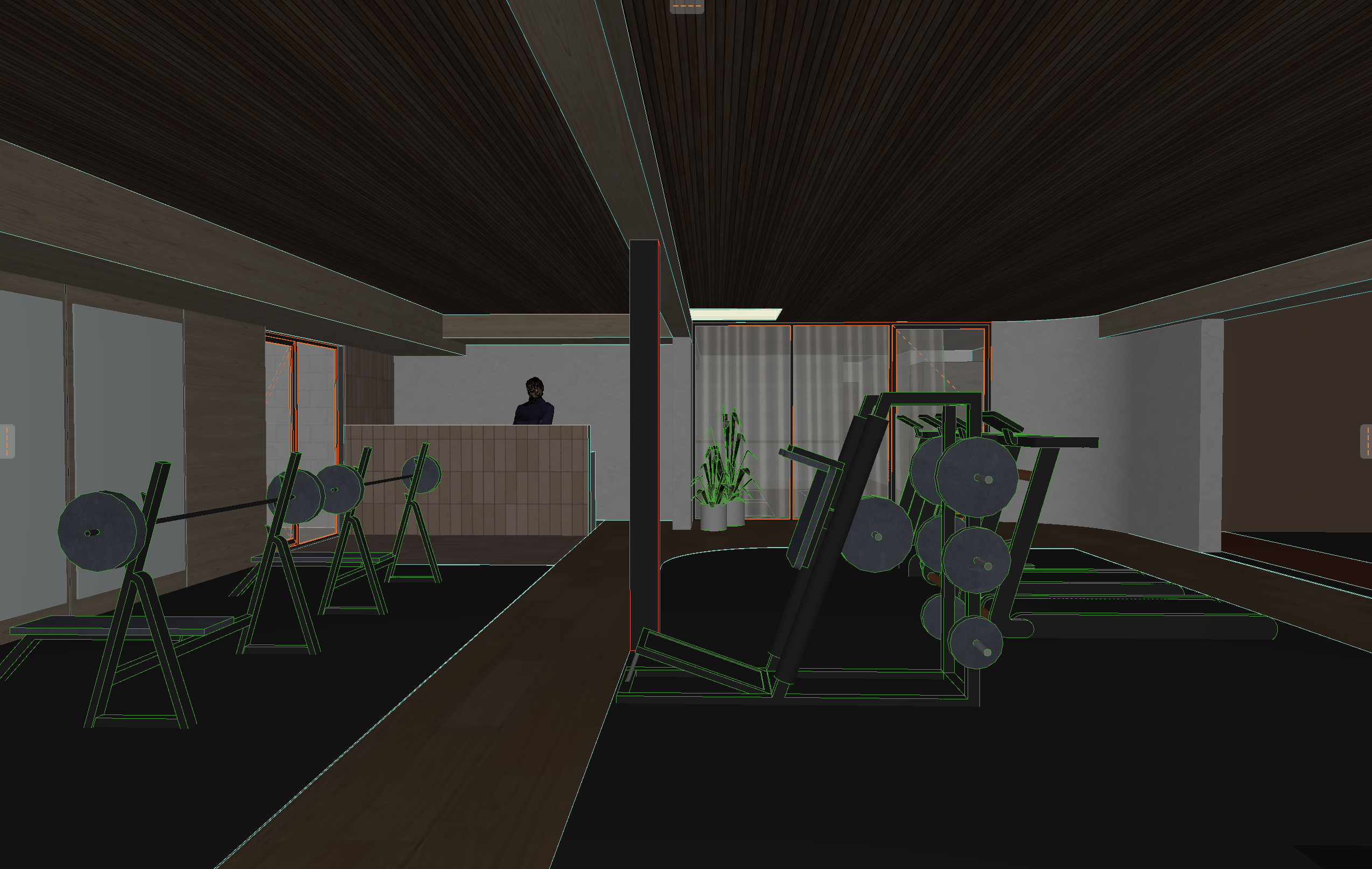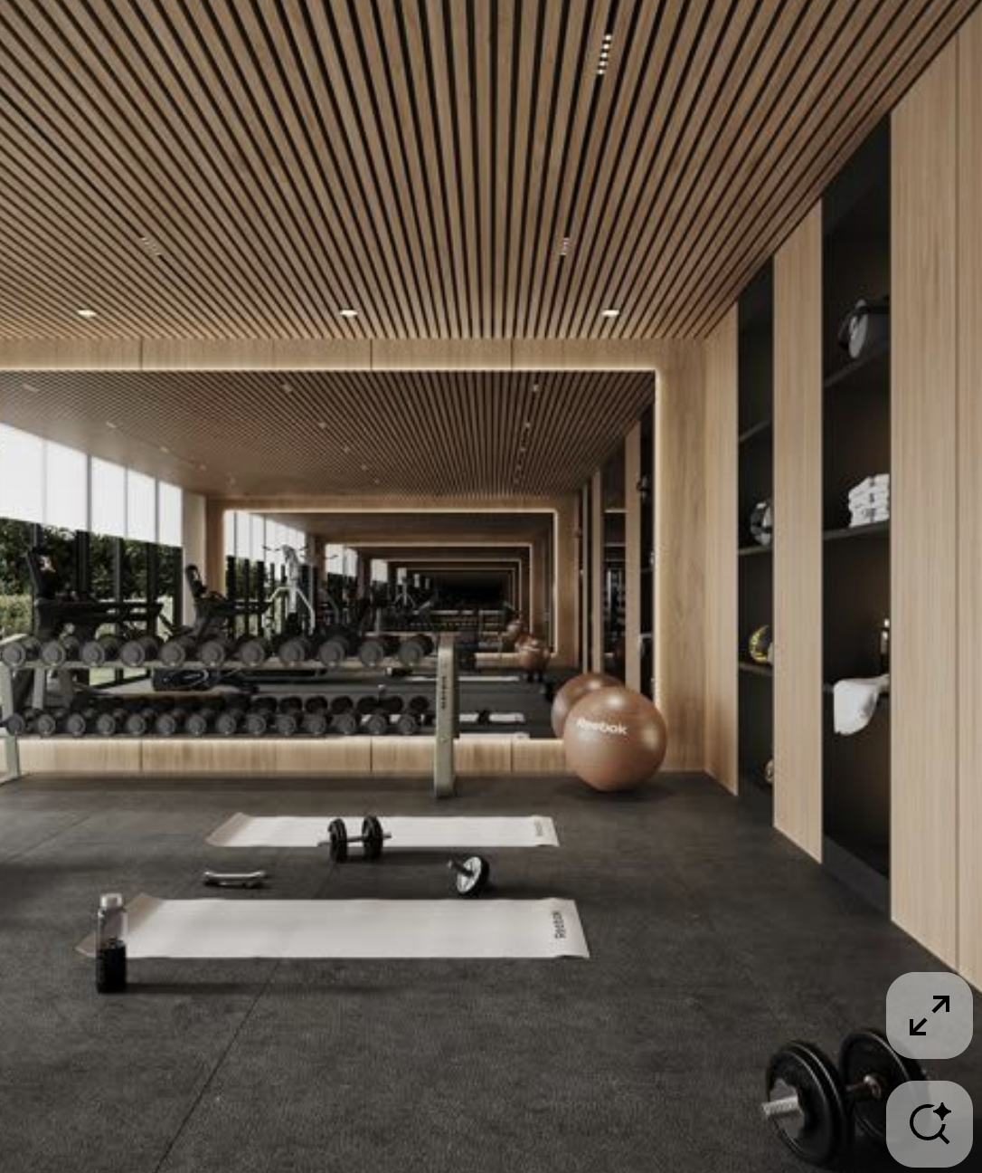 interior shot can you create a photorealistic render of this image and turn it into a gym interior at the far end of the image to the left is the glazed entry doors and a tiled terracotta reception desk and floor the rest of the flooring is timber overlay and black rubber gym matting large full height backlit mirrors on the side walls the wall at the back is to be a curved wall of venetian plaster with full height glazing inserts and full height sheer curtains the ceiling is to be thin timber slats panelling the only natural light in the space is from a 1m x 1m light well to the right hand side of the reception desk all other lighting is to be warm indirect led strip lighting