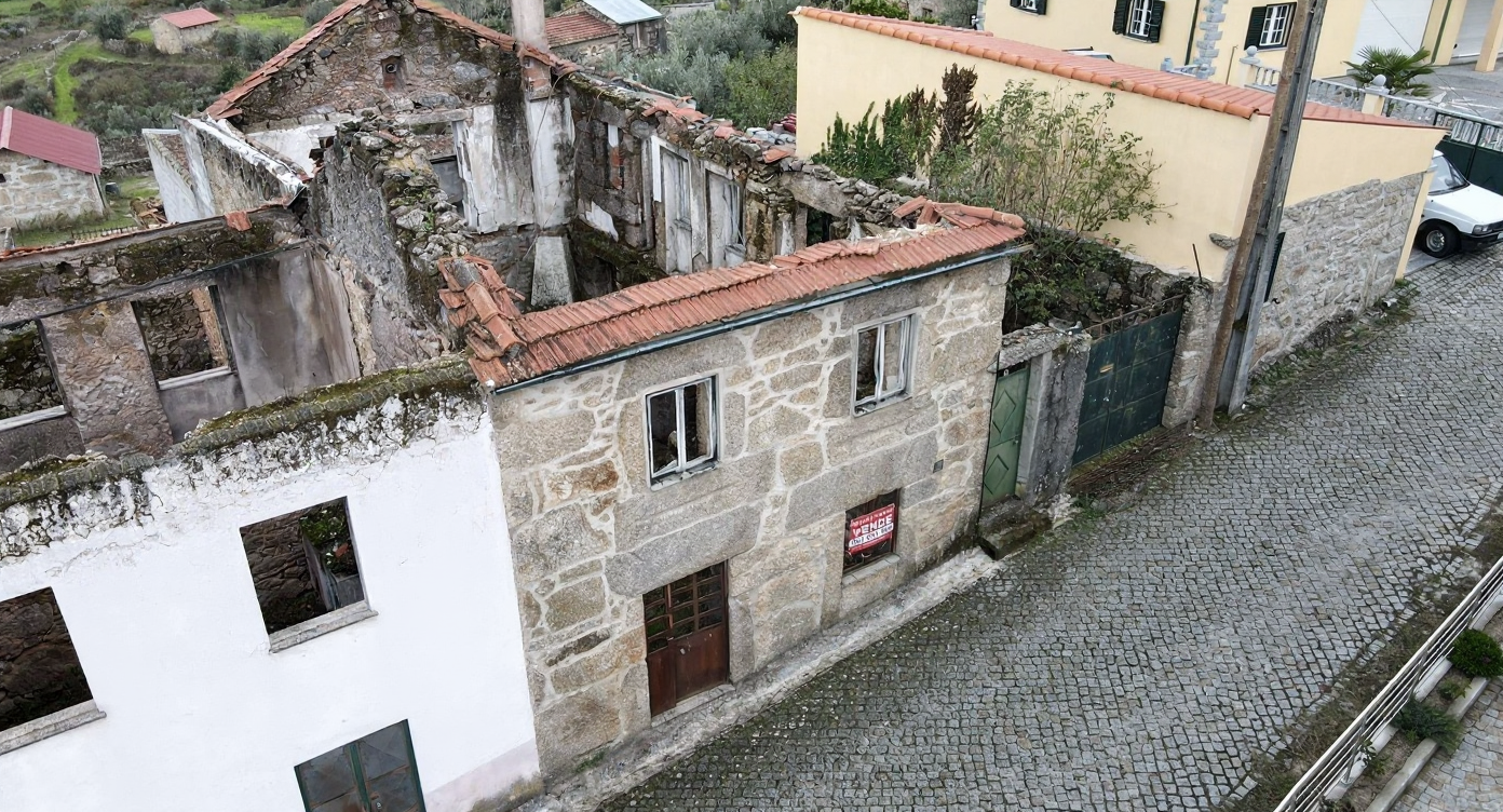 using the provided image remodel only a stone house outlined in red keeping the exact same angle lighting perspective framing and surrounding environment unchanged reconstruct a complete ceramic tile roof over the entire outlined structure properly aligned and fully finished renovate the stone fa ade by restoring cleaning and repairing the walls while preserving the rustic style keep all doors and windows in their original positions sizes and alignments replacing old frames with new wooden or aluminum ones while maintaining their original shapes do not alter any part of the neighboring buildings or the street the result should look like a realistic fully restored version of only the highlighted section of the house perfectly integrated into the original photo complete a roof of the stone house