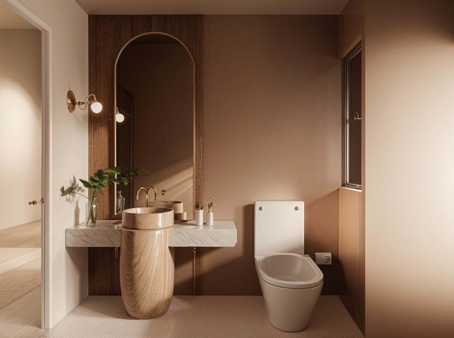 replace all wooden surfaces with natural light oak in a soft beige sand tone the wood should have a smooth vertical grain fine texture and a satin matte finish color between pale honey and light blonde warm but not yellow with a subtle sun washed effect remove all heavy contrast or orange tones make the island and floor wood consistent with the same natural oak shade seen in high end scandinavian kitchens the final result should feel bright airy and minimal with a refined coastal modern atmosphere picture replace in creamy braun beige tone ocean picture just like on the picture showing color is a mix of warm sand palme honert and light blond oek elegant and bright