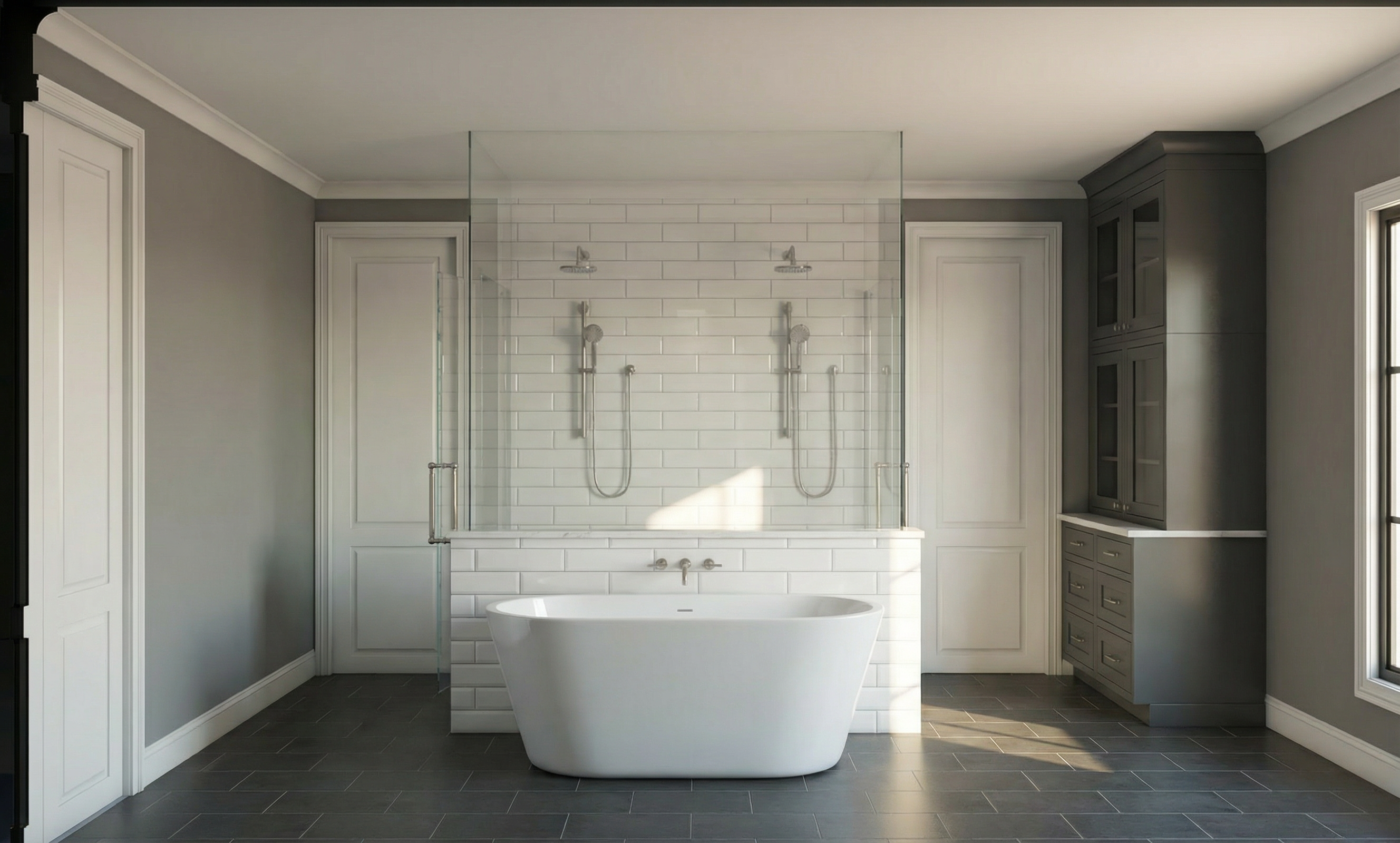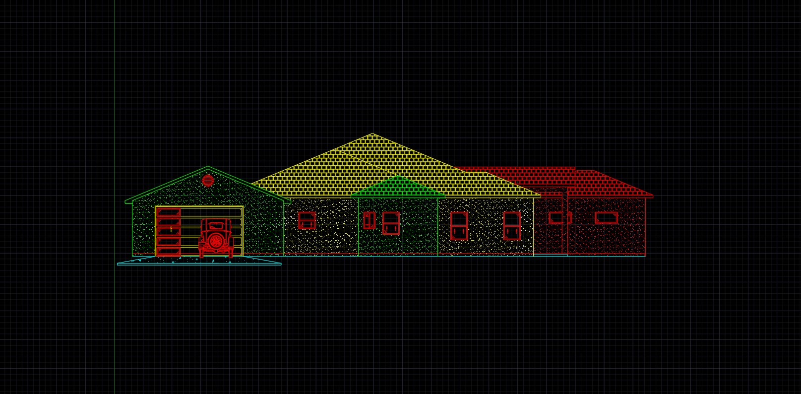 generate a beautiful front elevation render with light inside white stucco on the front walls and a gray flat tile roof modern exterior elevation in an open field with grass a sidewalk along the front of the house and one dog and two people car at front of garage