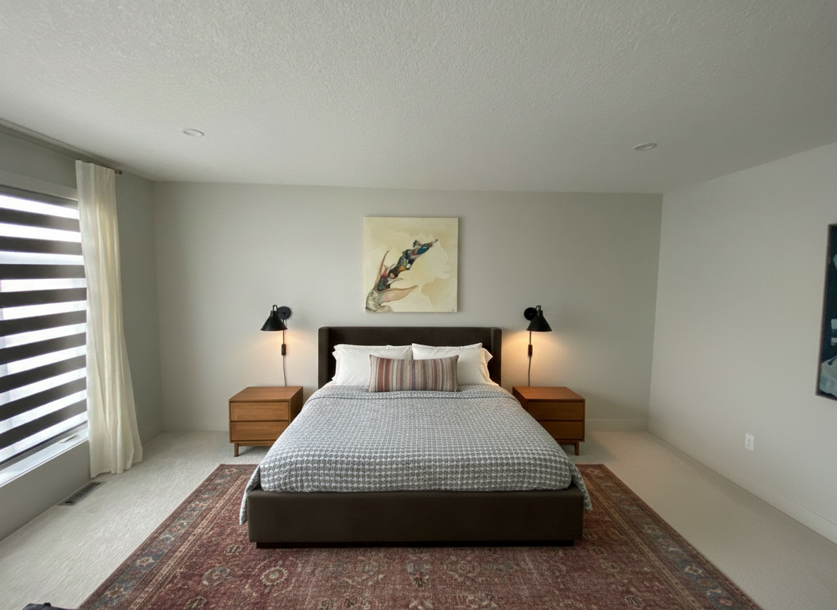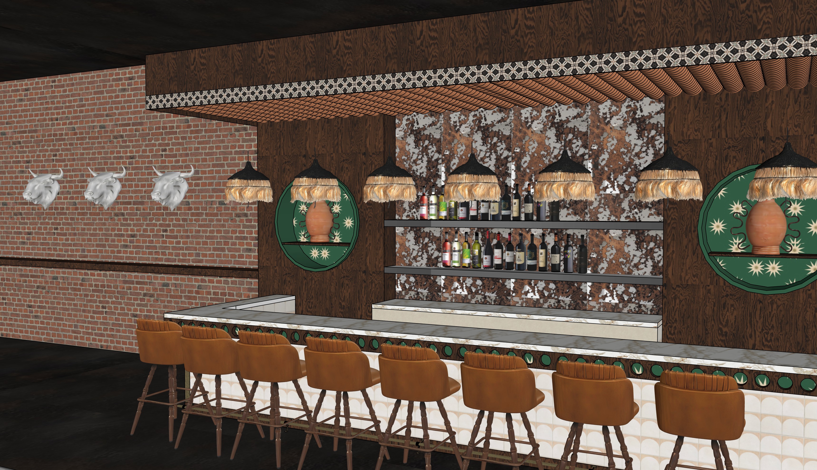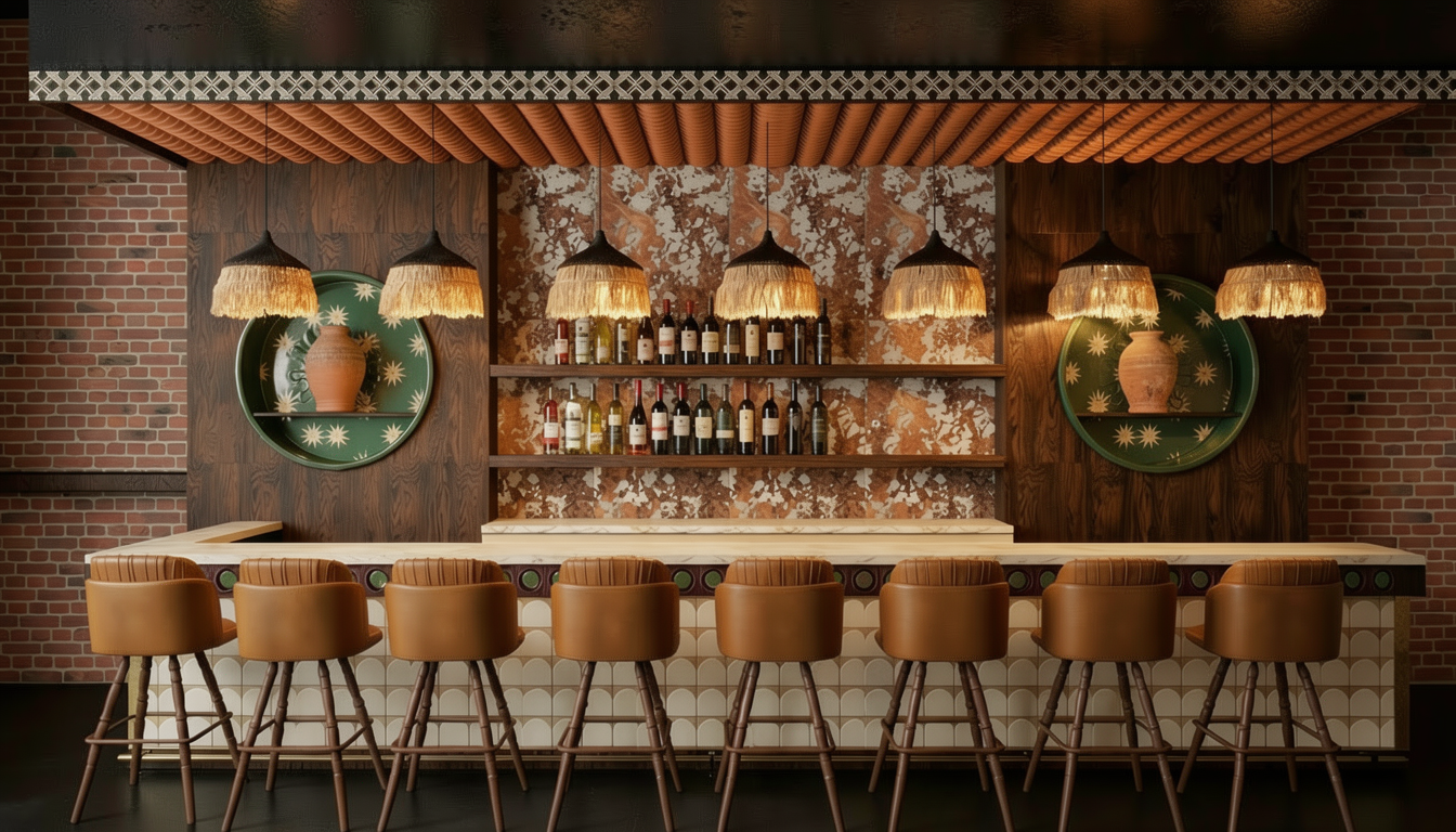 photorealistic upscale spanish tapas bar interior straight on perspective of bar and back bar warm moody hospitality lighting cinematic atmosphere dark stained oak wood bar millwork with rich visible grain and satin finish realistic natural wood variation and imperfections creamy travertine stone bar top with subtle veining honed finish soft edge detail custom bar front with rounded penny tile in warm cream tones and circular inlay accents in olive green and burgundy authentic ceramic texture with real grout lines back bar shelving with realistic glass wine bottles natural reflections slight imperfections physically accurate glass transparency back wall clad in expressive marbled stone tile in warm cream rust and brown tones with organic natural variation decorative spanish inspired ceramic canopy soffit detail in warm terracotta tones with individual tile depth and shadow large circular green niches inset into millwork with spanish ceramic texture containing handmade terracotta vessels with natural imperfections warm leather bar stools in camel brown leather soft creasing realistic stitching natural patina wood legs with realistic finish wear handmade fringe pendant lights with black shades and natural raffia fringe warm 2700k light temperature soft glow and realistic shadow falloff exposed brick wall with authentic texture and color variation black ceiling above with subtle texture low reflectivity professional architectural photography shot with 35mm lens eye level perspective shallow depth of field global illumination ray traced lighting realistic reflections soft shadows ambient occlusion materials highly detailed physically accurate tactile no plastic appearance warm intimate moody spanish cocktail bar atmosphere architectural digest style editorial quality extremely photorealistic
