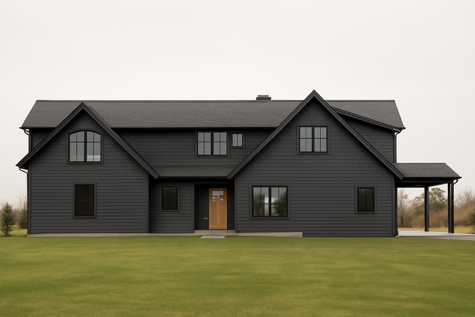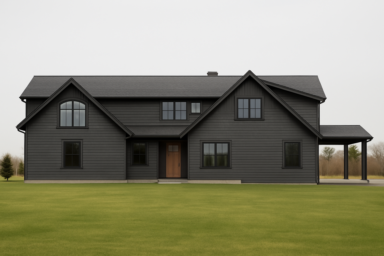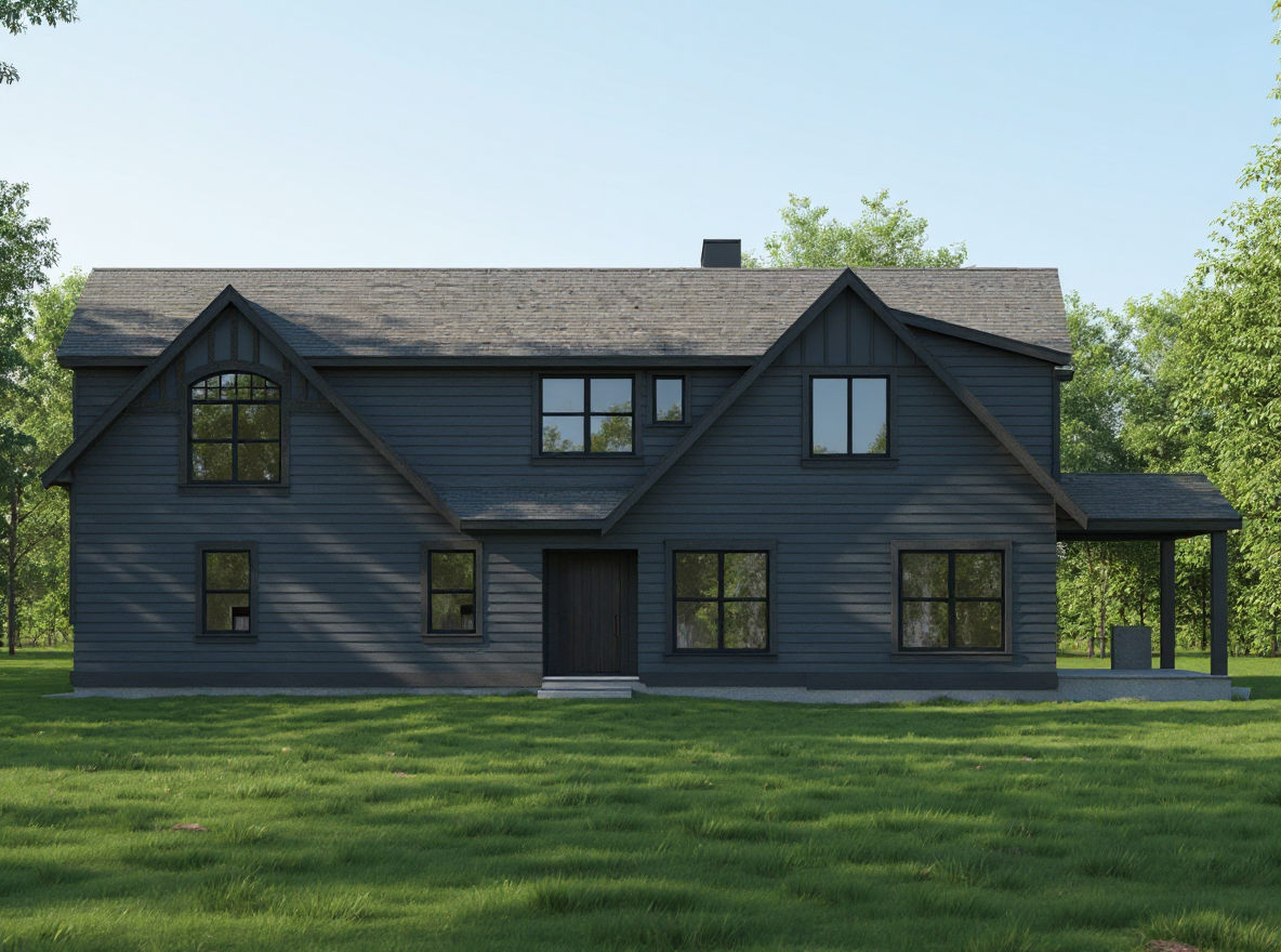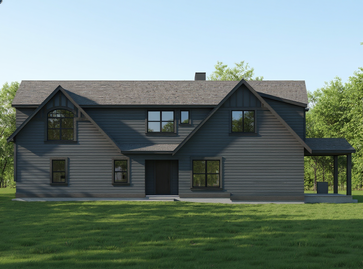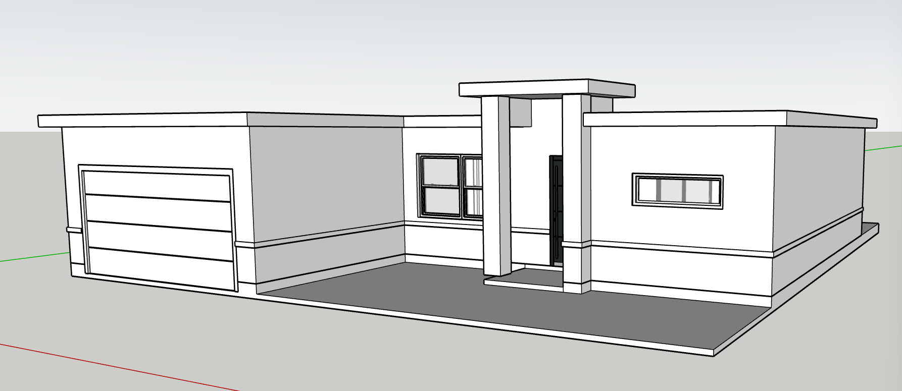 generate a photorealistic exterior render of the one story modern house based on the provided sketchup model and the architectural drawings a2 floor plan a4 elevations a5 roof plan follow all the dimensional and proportional details from the drawings add the complete sloped roof system hip roof as shown in the a4 and a5 plans with 5 12 roof pitch and 1 4 eaves architectural style modern contemporary florida residence similar to the santa cruz ii model by lifestyle homes materials and finishes walls smooth stucco in light beige or off white color roof architectural asphalt shingles in medium gray fascia and trims white front door dark wood or charcoal gray modern style windows white aluminum frames with clear glass reflections garage door modern flat panel white base trim band around the house light gray tone driveway and entry path light gray pavers columns smooth stucco with white trim matching facade design add realistic shadows and sunlight from a clear sky lighting and environment soft daylight slightly warm natural shadows green front yard with florida style landscaping palm shrubs trimmed grass background with light blue sky and some trees photorealistic materials and reflections do not change wall openings proportions or window and door positions keep roof slope overhang dimensions and elevation proportions consistent with a4 drawings architecture