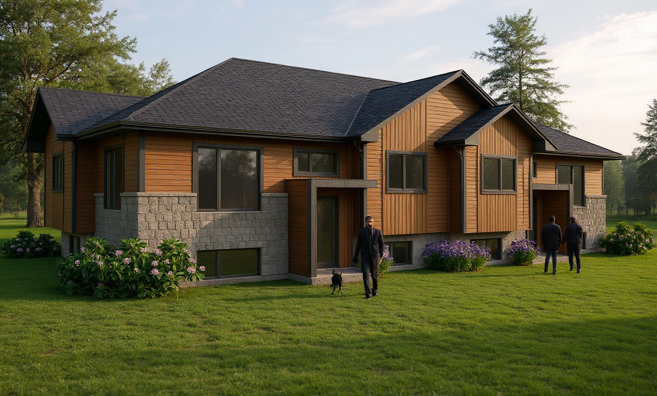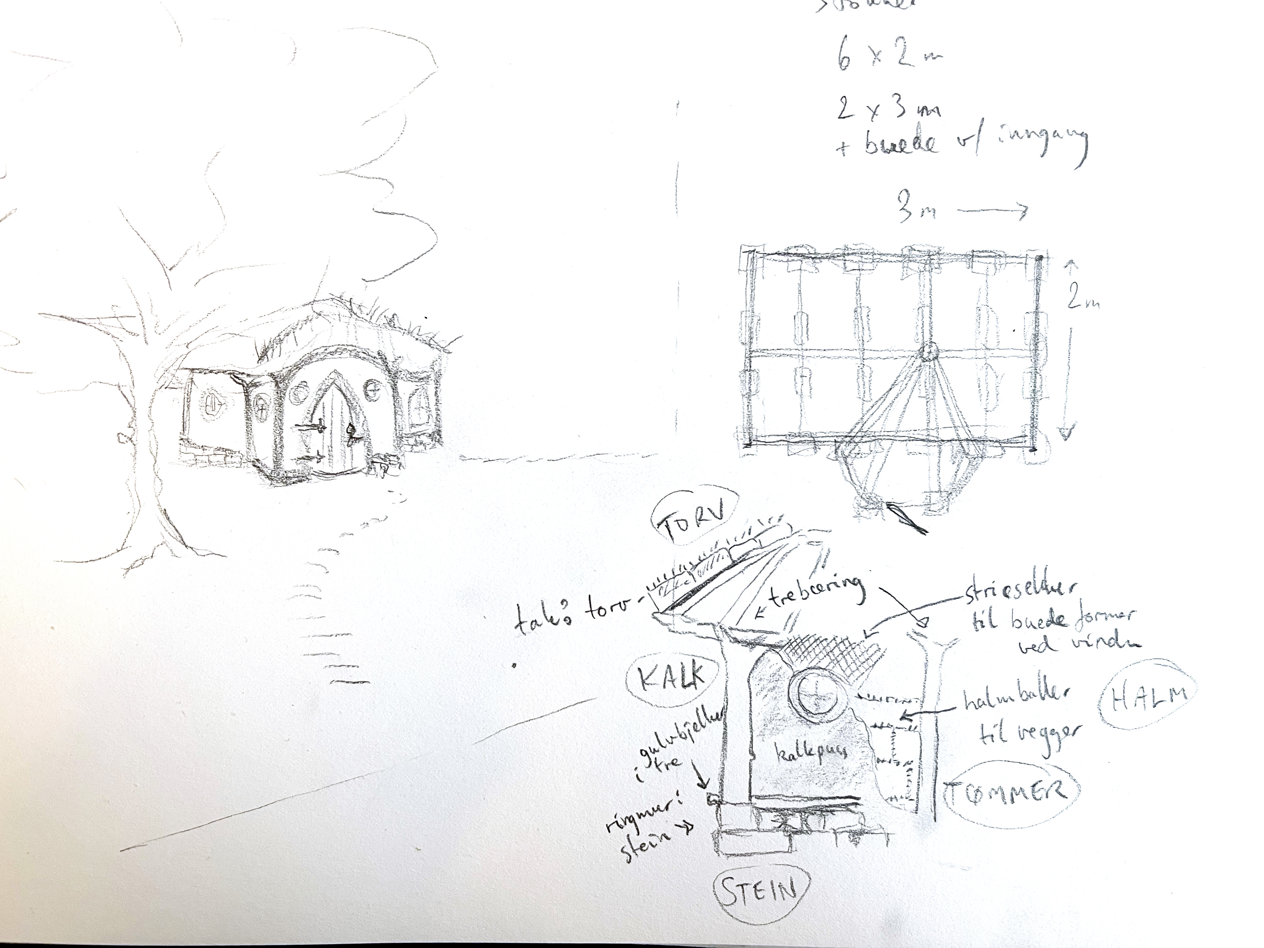 exterior shot focus on the hobbit style building on the left which is situated under a tree it has grass roofing straw and clay walls with soft mint painted exterior warm wooden details and a cosy feeling about it the house is a small carpenter shop so it could have some details such as wooden carvings hinting on the usage