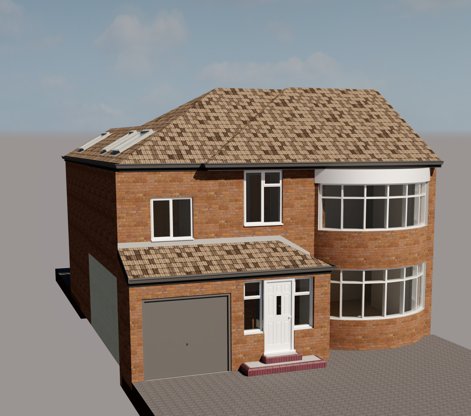photorealistic uk house renovation rear extension and loft conversion do not change building form or materials add realistic uk garden lawn planting patio and fence soft overcast daylight neutral sky minimal context