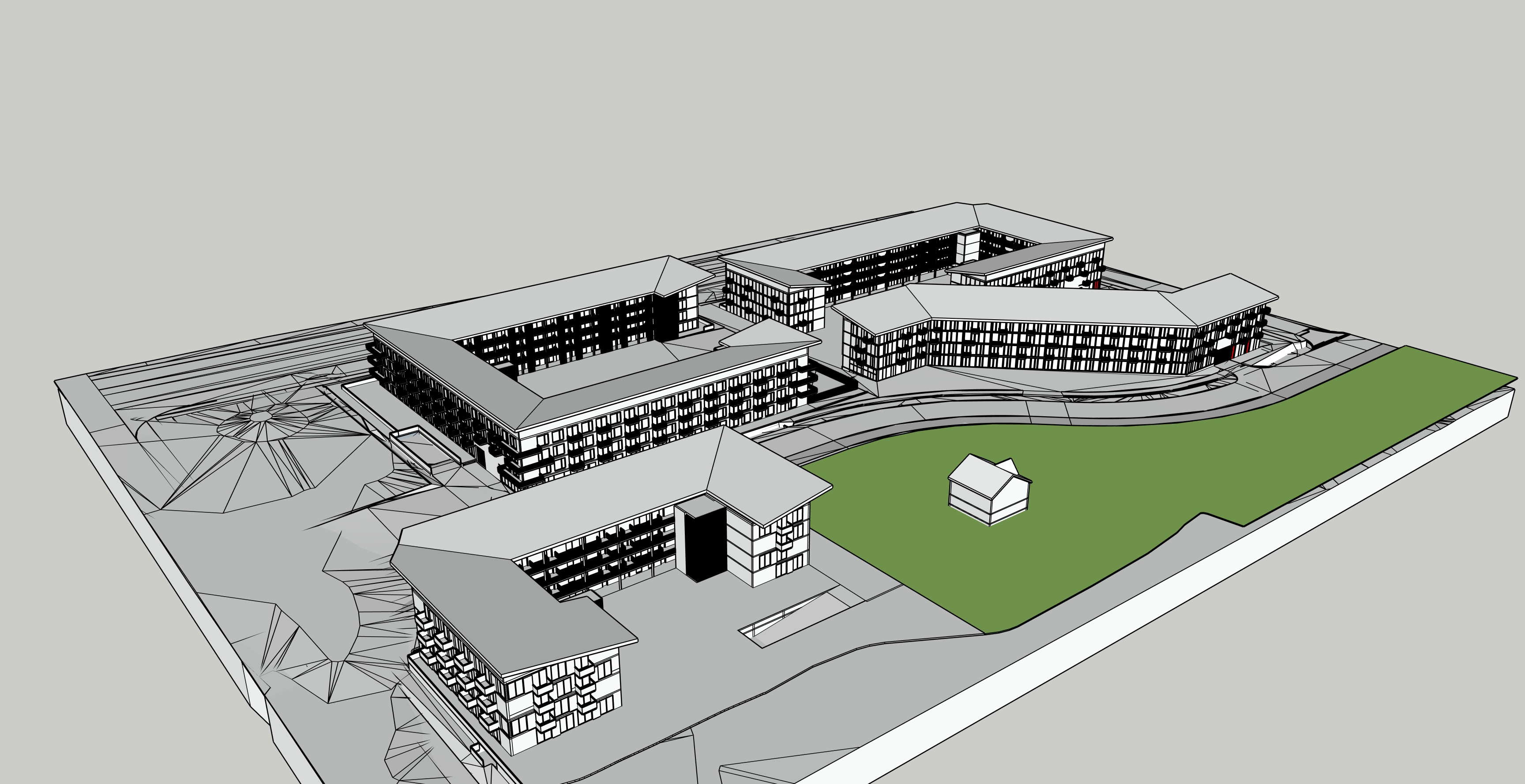 a modern residential building sunlight filtering through sharp shadows on the concrete provide landscape on the ground floor hyper realistic architectural photography