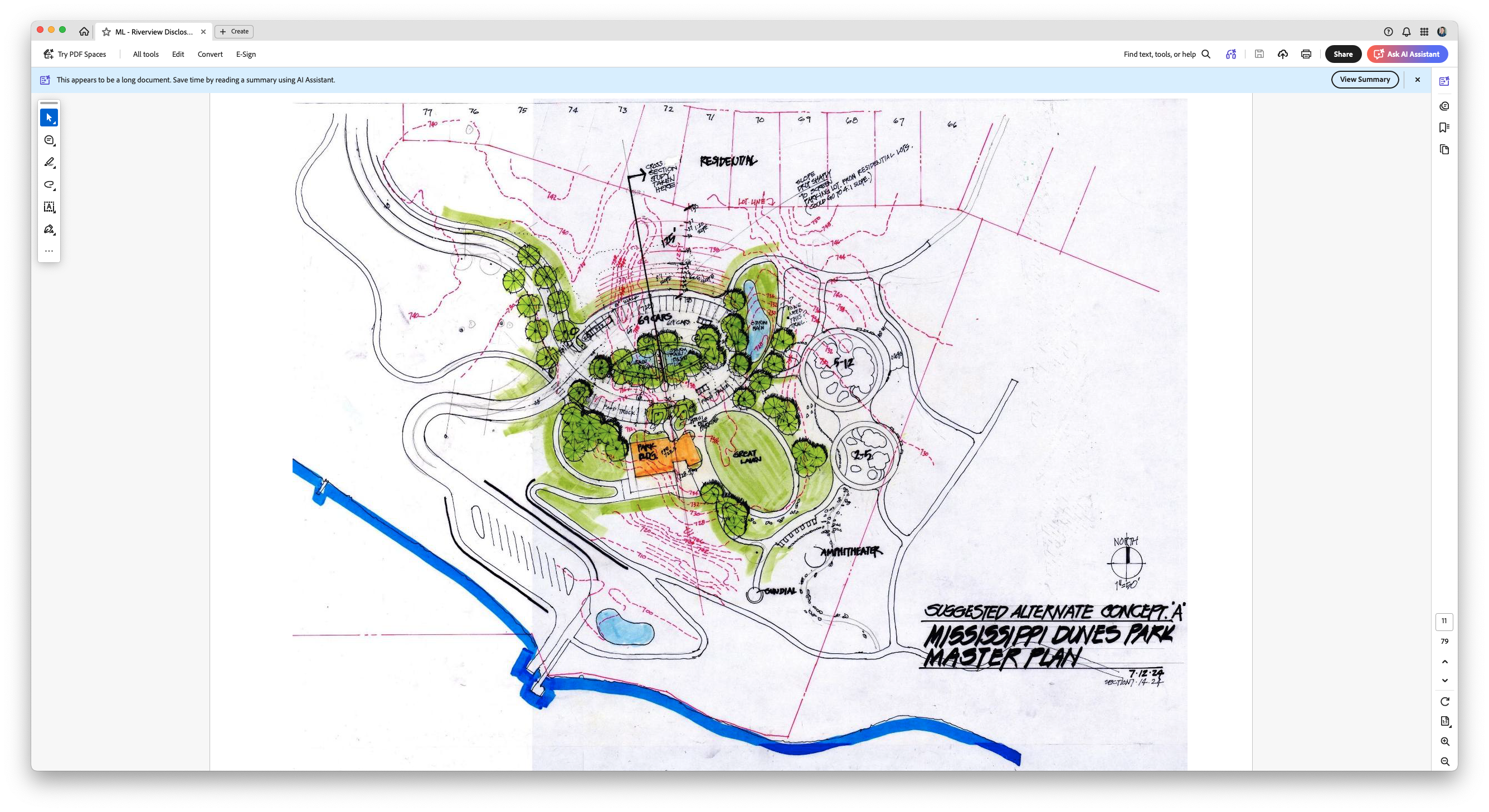 grainy watercolor render of timber frame building with reclaimed wood siding and stone wainscot watercolor trees and urban environment in the background extensive watercolor landscaping surrounding the building