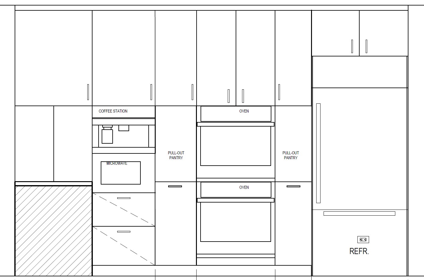 generate and interior kitchen based on the drawing attached finish to be walnut all the elevation is 26 deep there are 2 built in ovens next to it there are 2 pull out drawes and a built in coffee maker and microwave there is no stove at this elevation only 2 built in ovens on top of each other all the elevation is flash without any niches