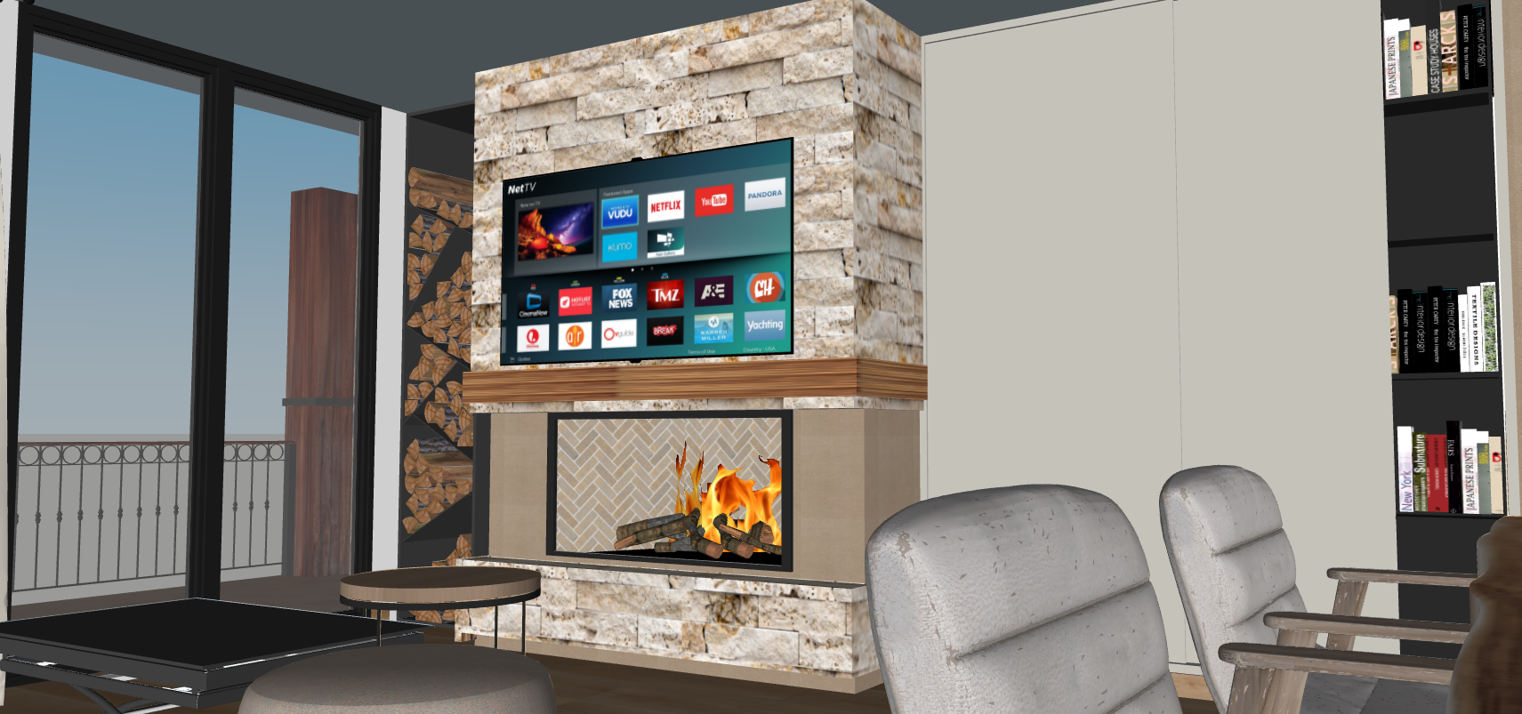 chimenea con piedra natural lamparas en vidrio negro con luz bombilla calida sillas con peluche corto victas a anodrra nevado