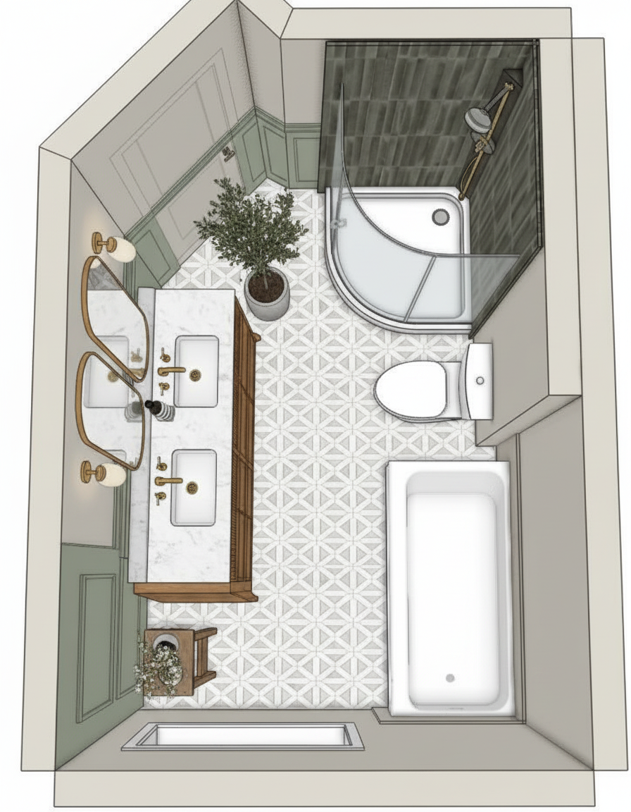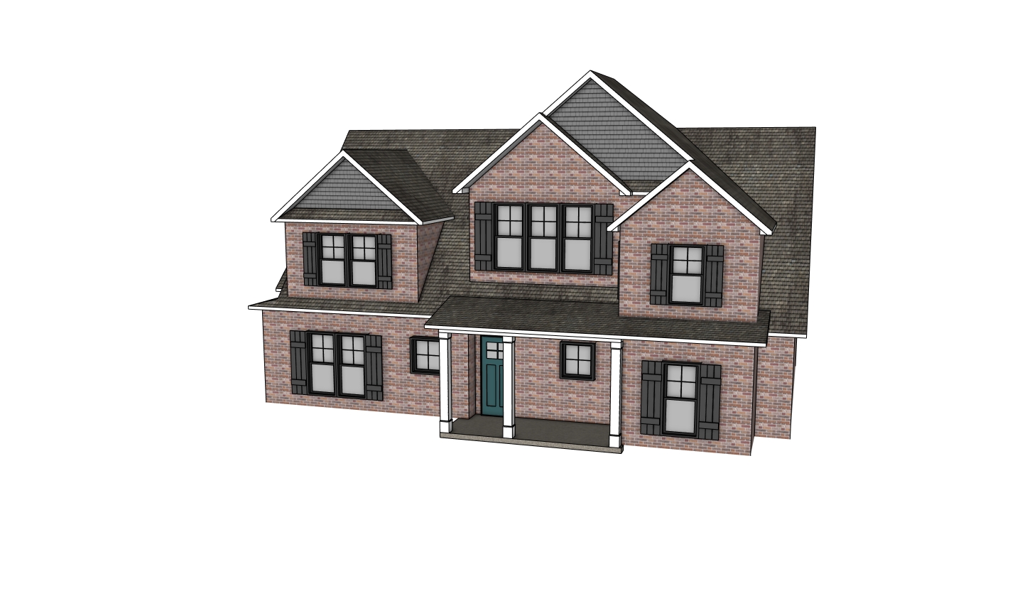 render a classic american two story house with elegant brick texture rich warm brown tones and subtle variations of brick red and soft beige the roof should feature dark charcoal gray shingles adding depth and contrast frame the windows with striking black shutters use white for the trim and pillars to create a crisp clean look the front door is a deep teal providing a vibrant focal point set the house in a serene peaceful suburban atmosphere with a bright clear sky land descends on right side with a basement garage