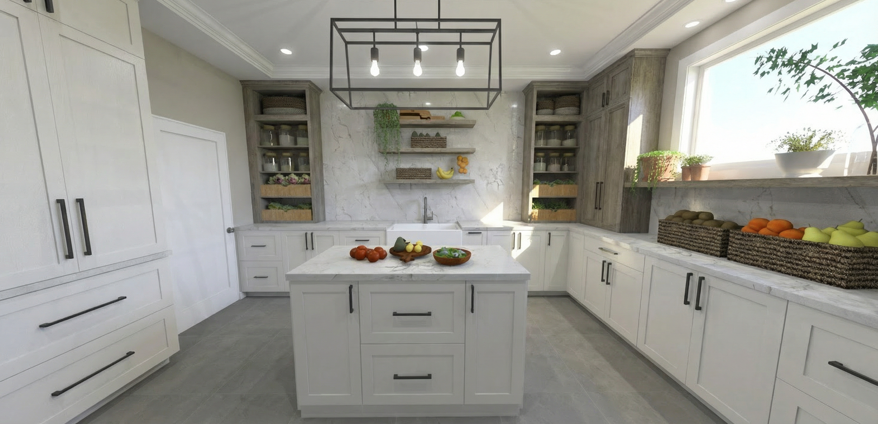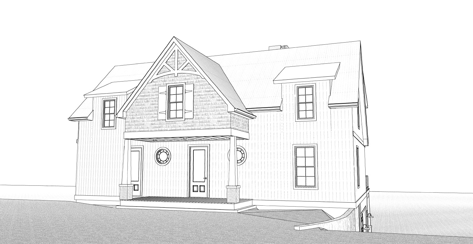 exterior shot use the attached line drawings rendering to create a color photorealistic image do not change anything about the architectural structure maintain the house exactly as is but add landscaping and neutral colors to the facade mix stone or brick and hardie