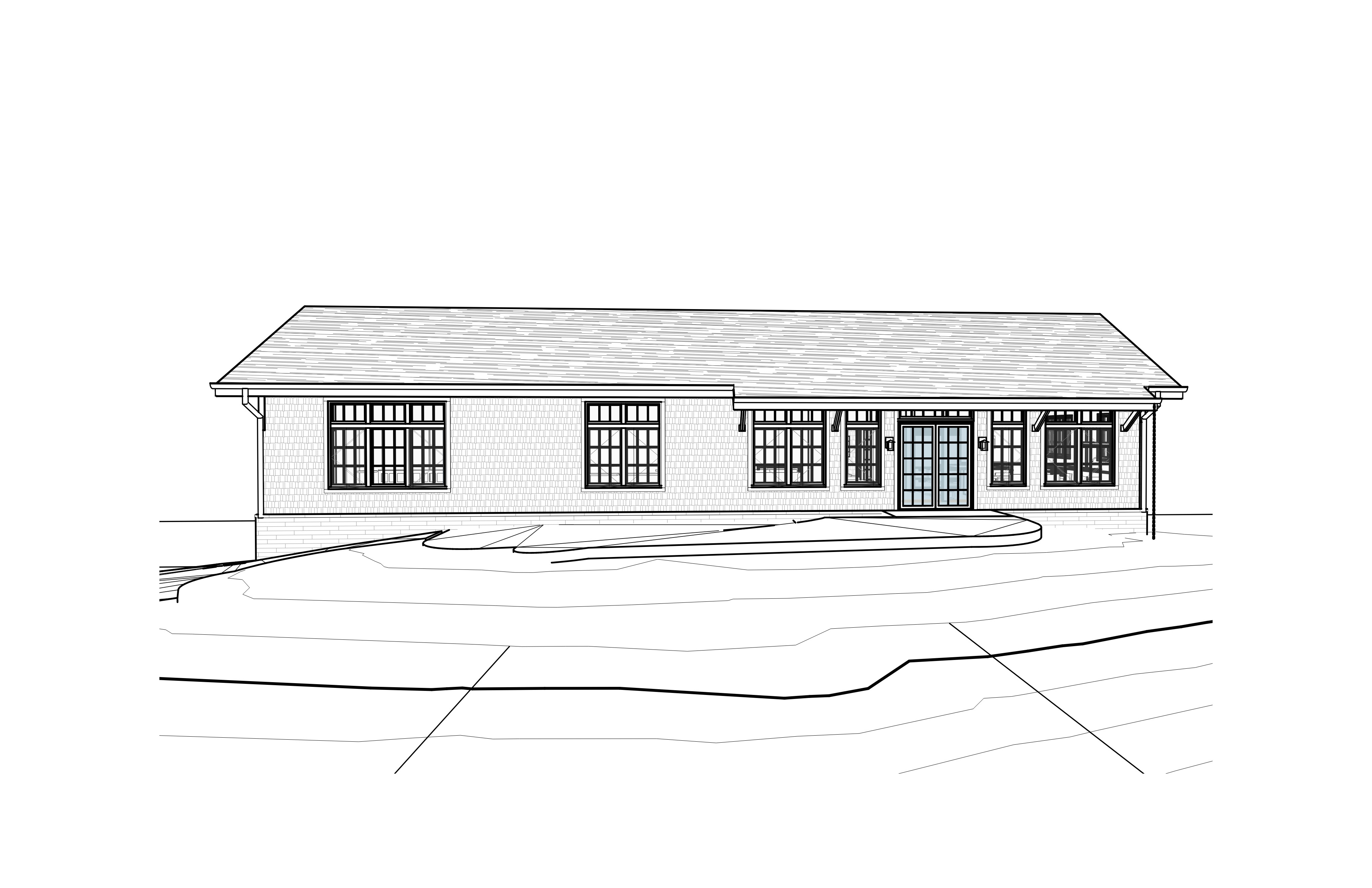 weathered gray cedar shake shingle siding gray trim to match medium gray shingle roof modern stone base ferns around base southern pine forest at sunset in background lake shore in foreground slope grade up to door
