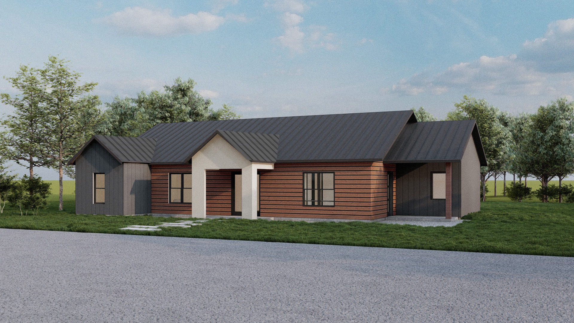 make this more realistic enhance the materials daylight and airy atmosphere with clouds the lights are dimly visible through the windows the environment is central texas with trees and a residential fence