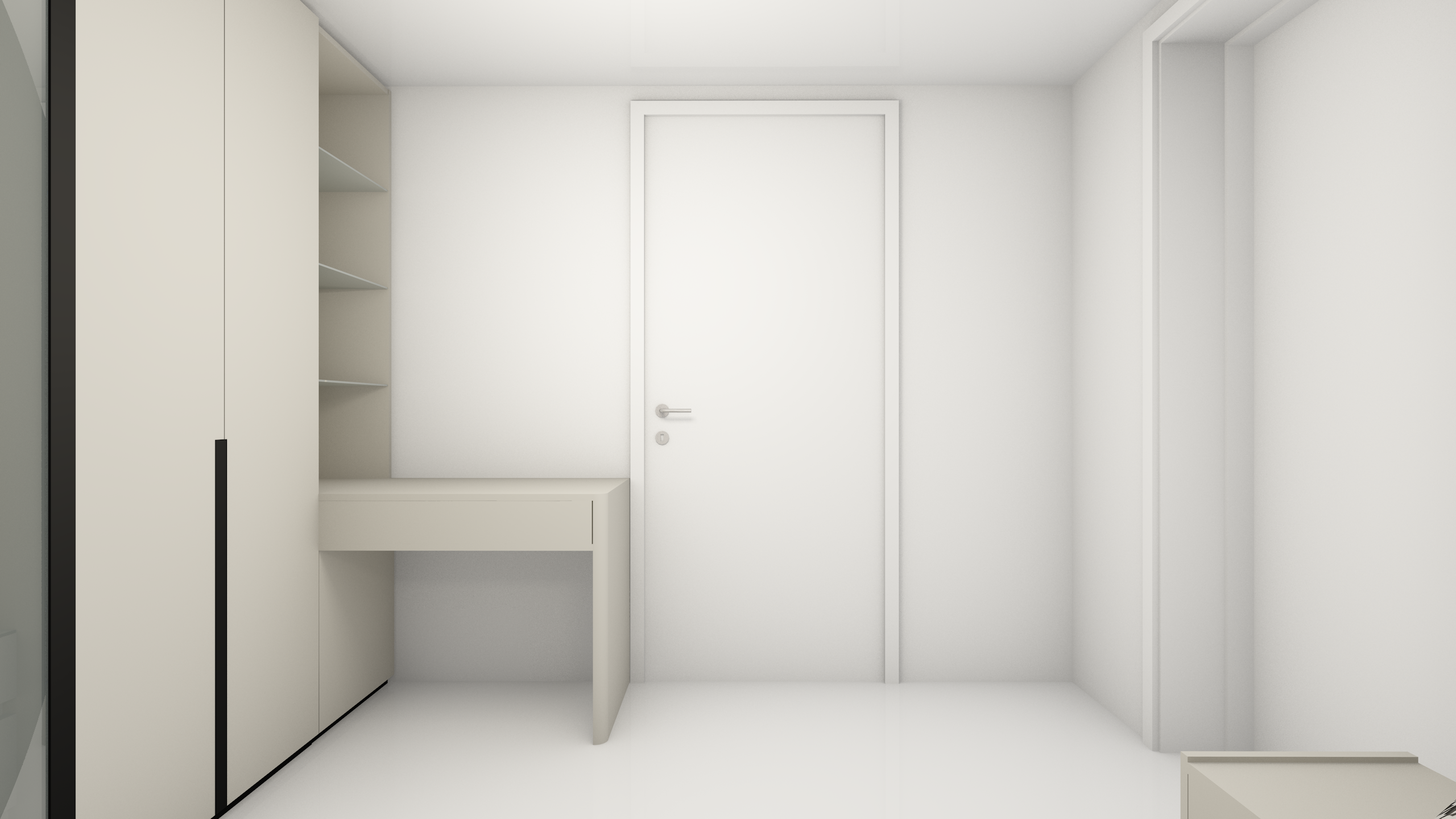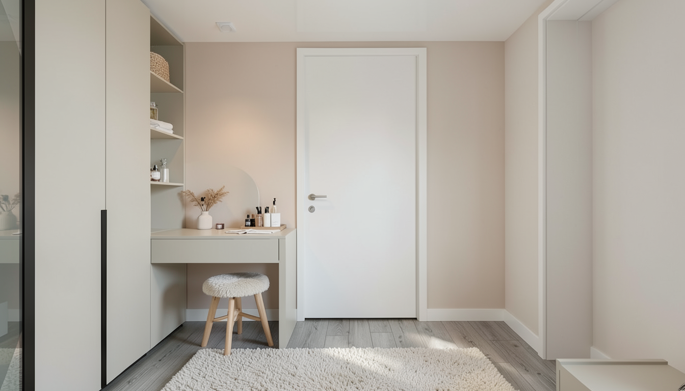 minimalist cozy bedroom soft colors grey oak laminate flooring a makeup stool a soft textured rug a organic round mirror