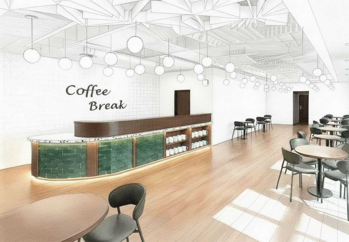 place a colorful mural on the blank wall do not put anything on the wall that says coffee break