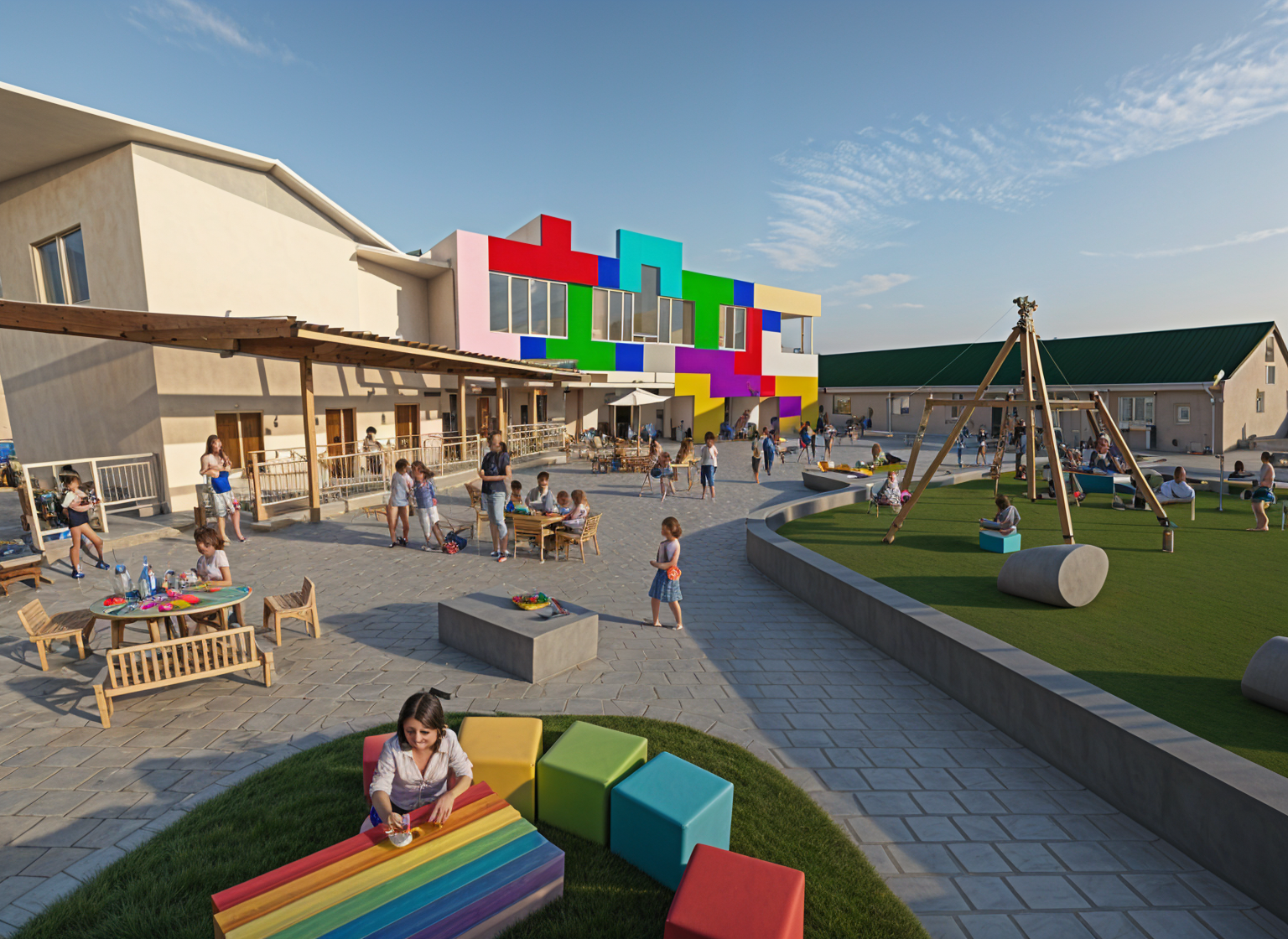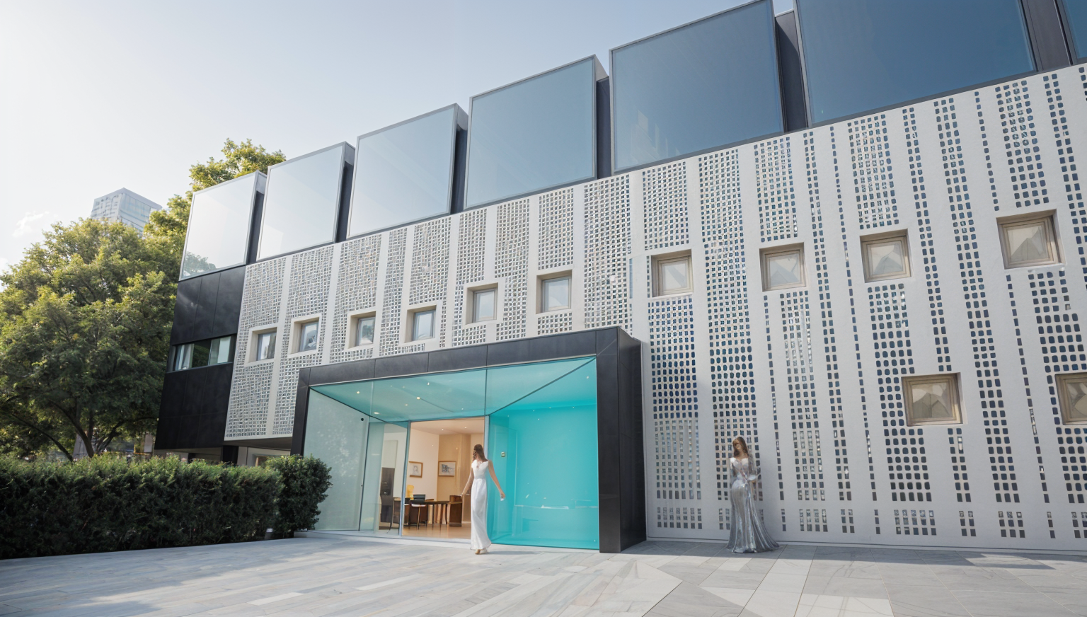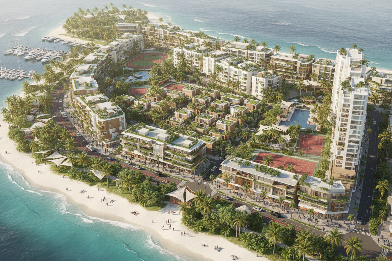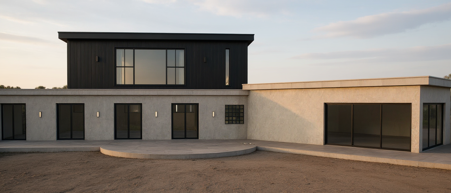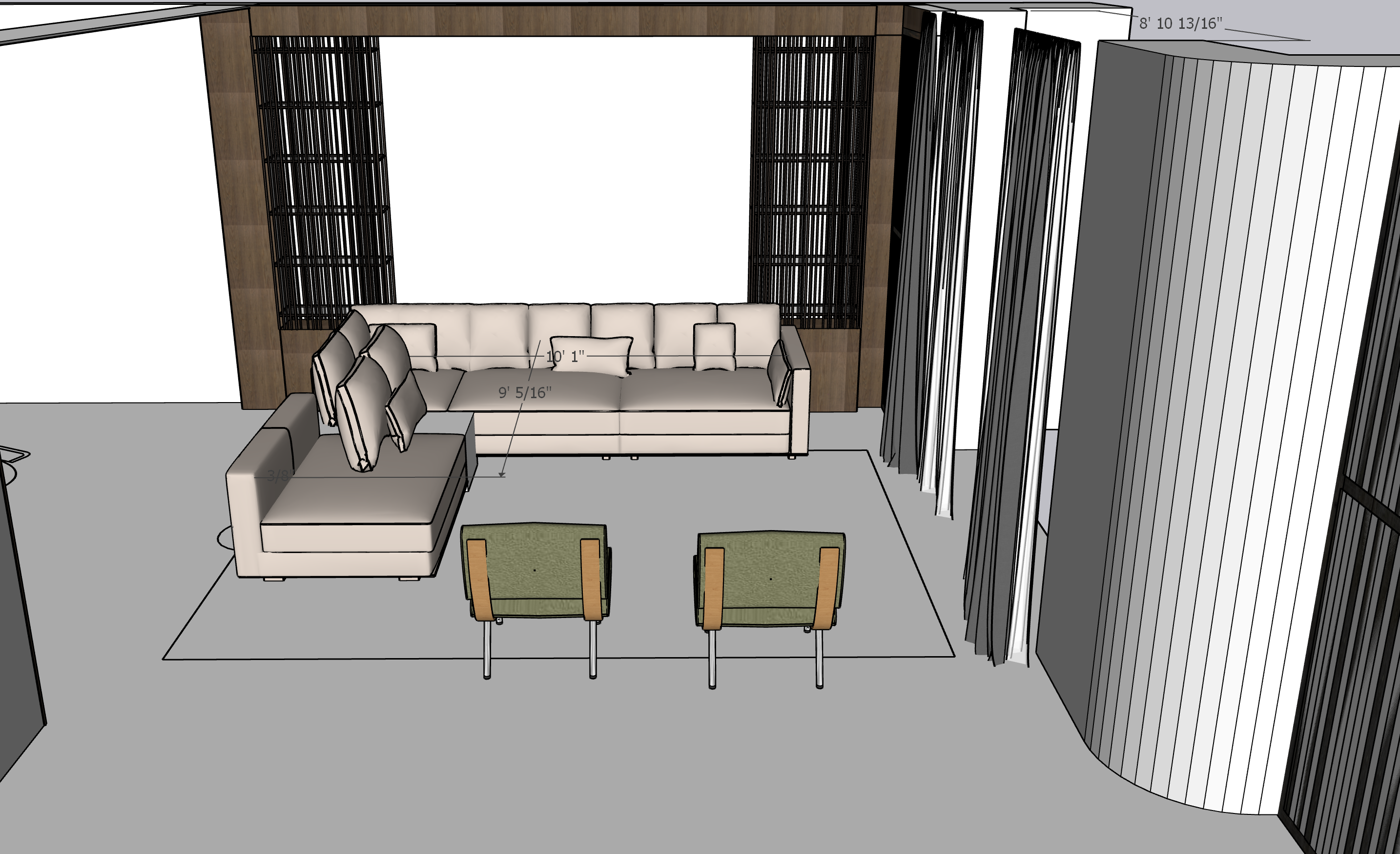 create a luxurious modern living room include a large beige sectional sofa with plush cushions add two elegant chairs with olive green upholstery and light wooden frames the floor should be a soft cream carpet incorporate sheer white curtains and color block drapery in front of sheers to add contrast and sophistication use ambient lighting to create a cozy and inviting atmosphere white oak plank floors installed horizontally