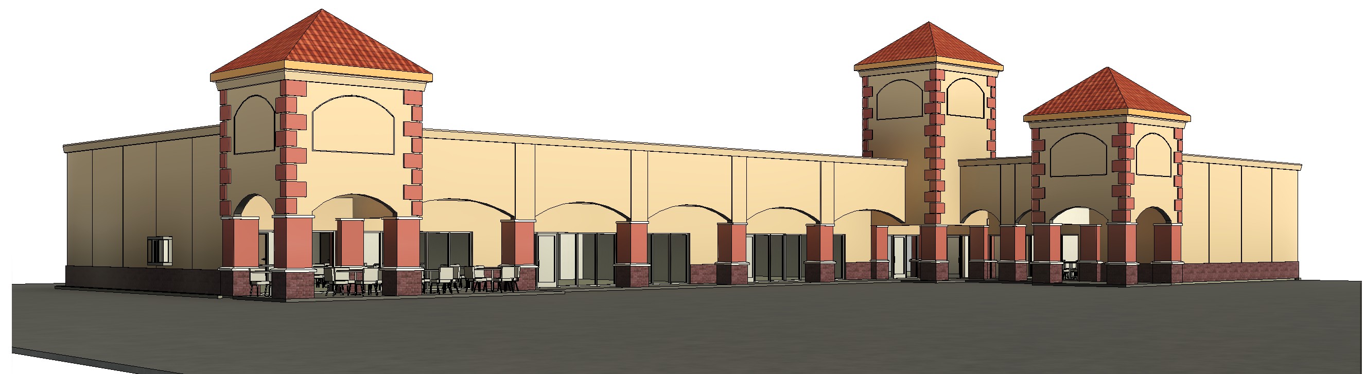 add shadows in the porch and a few people walking in the porch and toward it add a few people sitting at the tables clouds and sky have a car pulling up beside the end of the building by the window realistic setting
