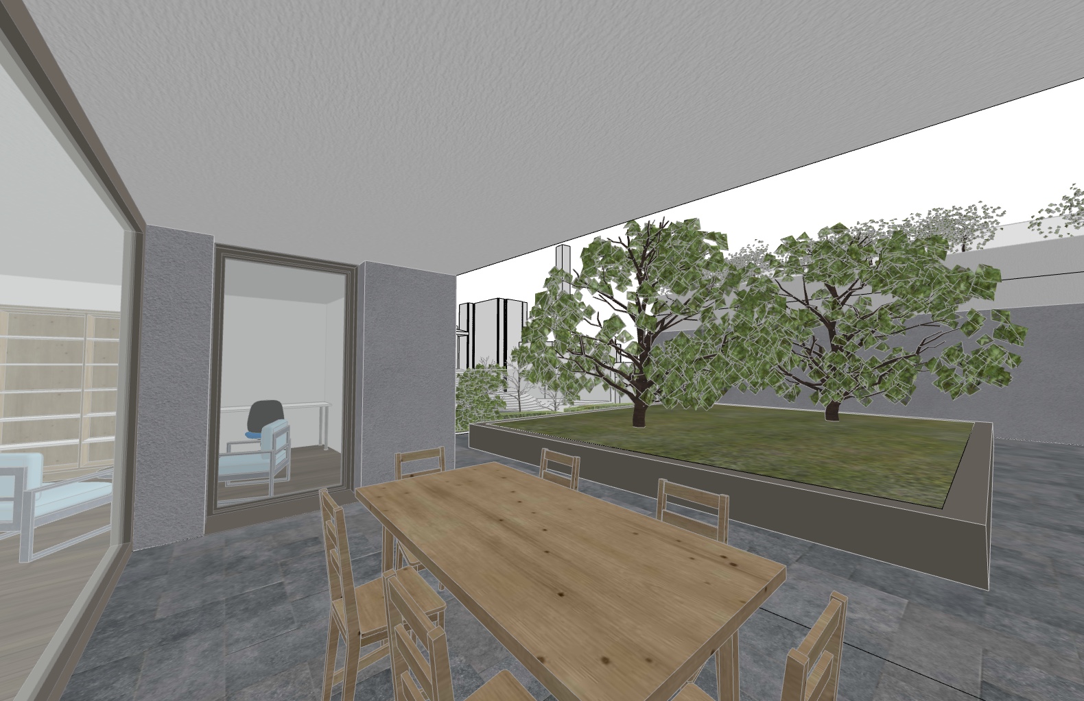renderize this image applying realistic materials close to the color of the input image dont change the perspective and the dimension of the image add some people and objects to add realism don t show the sun in this image sky blue and clear warm atmoshere