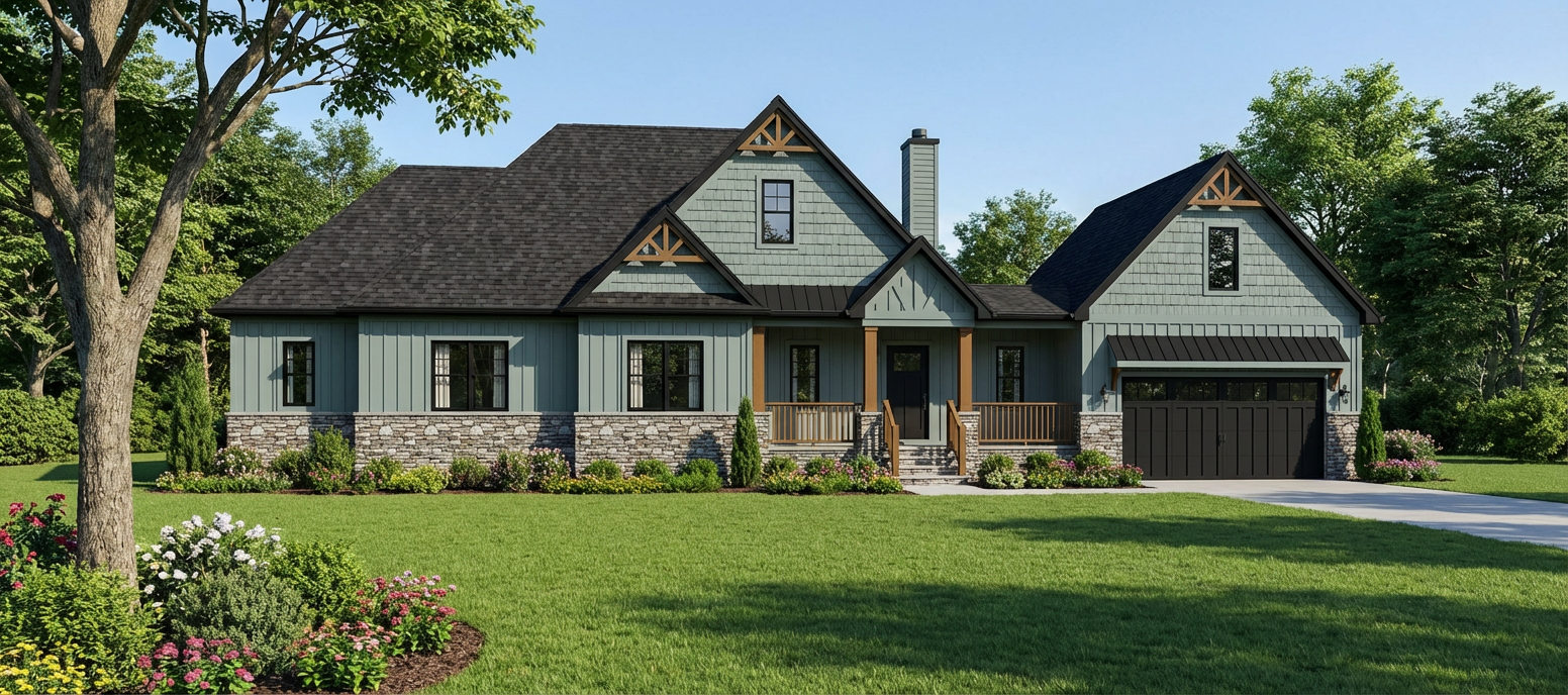 make as photorealistic as possible while keeping textures the same as shown professional landscaping in a suburb of greensboro nc 11am remove any text use the following finishes siding 7e9d9d shakes 7e9d9d windows black window trim black roof moire black soffit and fascia black front door 2e2e2f dutch quality stone steinhaus stack ledge black garage doors in design as shown posts and rails 8b5e2a