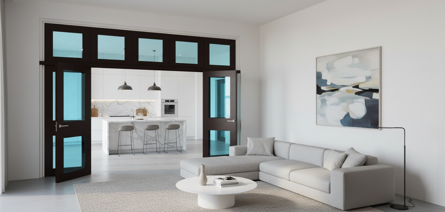 change the glass in the doors to clear and make the doors look like black wood with steel hinges and handles