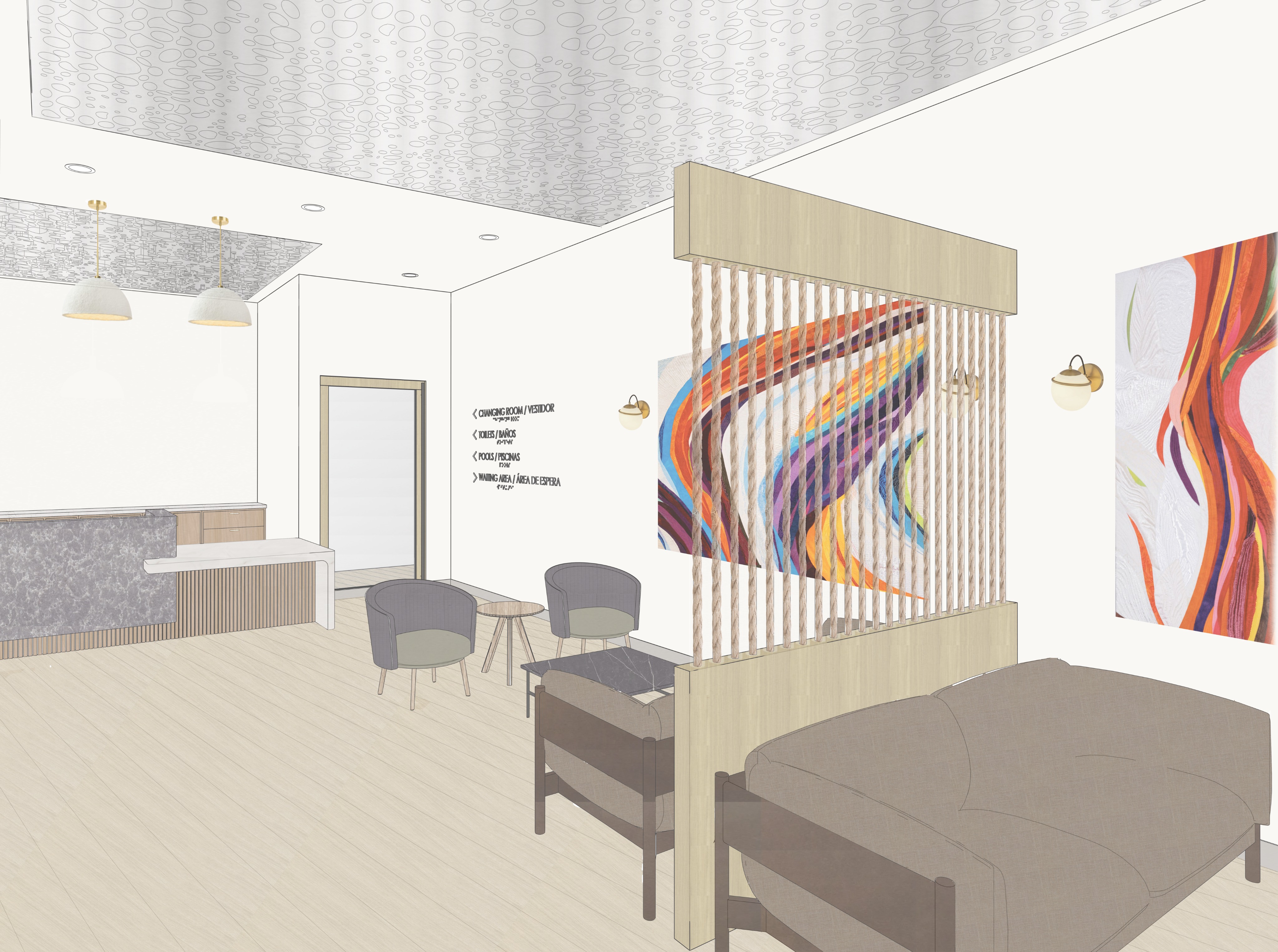 collage like render of public bathing space reception area make artificial lighting realistic and have natural daylight come through perforations in ceiling panels