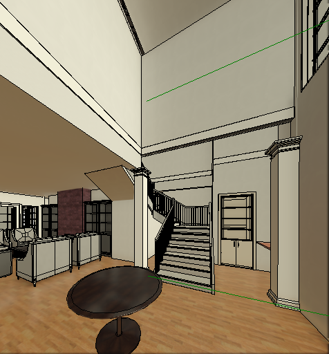 realistic image sunset light coming from the right side add rug under table add flowers on table put books on shelves decorative cream colored panels and trim on upper walls gothic arch between columns turn on interior lights remove daylight coming through windows make furniture upholstered show daylight through windows at doors on far left side add decorative mantel and light the fire add modern pendant hanging in foyer show doors with glass on rights side