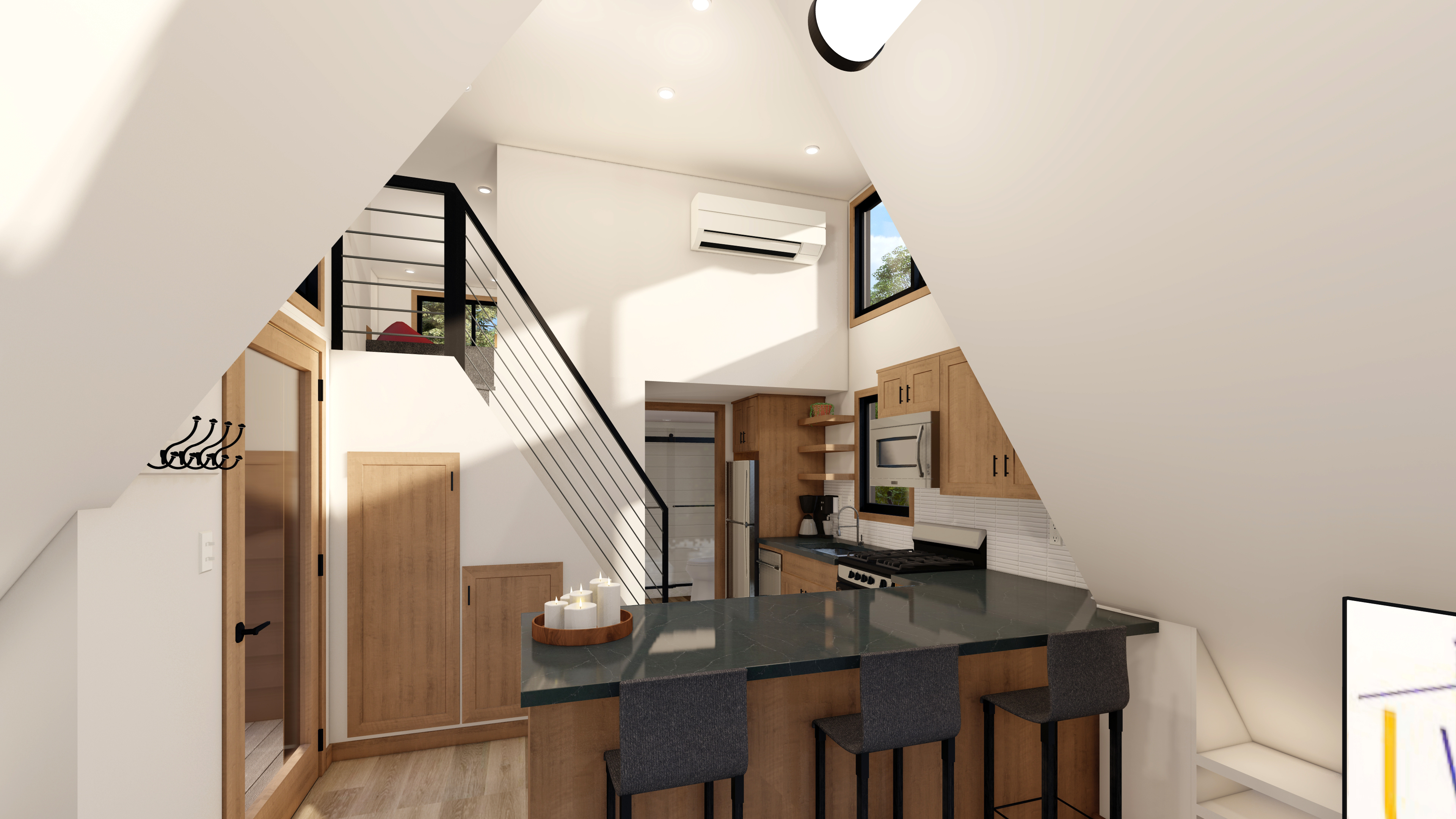 photorealistic interior architectural photography warm natural daylight under cabinet lighting and illuminated can lights in the ceiling soft directional light with realistic shadow falloff and gentle contrast bright but warm atmosphere realistic global illumination with subtle ambient occlusion in corners and at material transitions dslr with a 35mm lens eye level perspective professional architectural composition and framing and realistic depth slight depth of field foreground and midground in focus background softly flailing off physically based materials throughout with enhanced texture detail natural surface variation and subtle imperfections with realistic sheen high quality windows with realistic thickness subtle reflections of the interior soft exterior reflections and accurate light transmission windows feel transparent exterior visible through windows feels real and grounded with natural daylight realistic trees and landscape interacting with the light warm color temperature balanced with natural daylight soft highlights realistic shadows gentle contrast subtle camera noise natural exposure not overly sharp soften corners and edges professional photography style