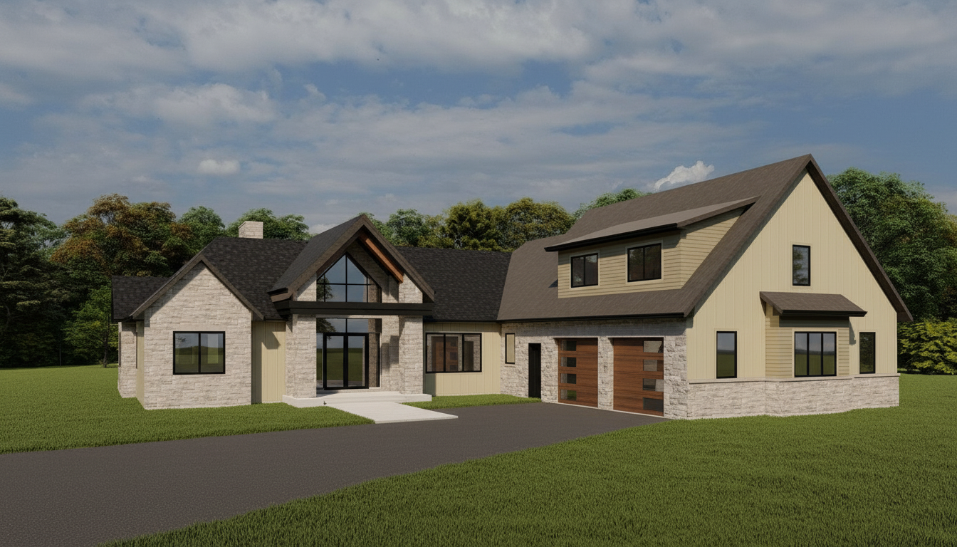 add realistic sky sun and shadows siding and shakes to be same shade of light tan driveway and walkway to be concrete