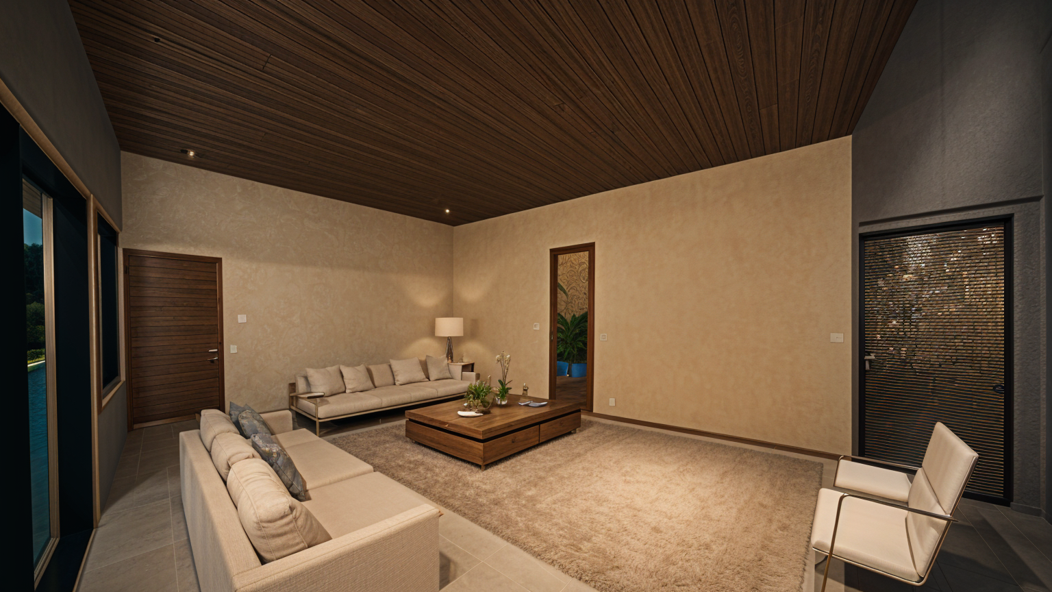 render an architectural scene of modern minimalist buildings with light gray walls and yellow wooden beams highlight large glass windows reflecting a clear blue sky surround the buildings with lush green grass and a few scattered trees with rich green leaves create a calm and serene atmosphere with soft natural lighting and a slightly cloudy sky architecture