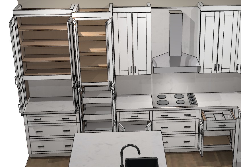 photorealistic architectural render of this kitchen from the exact same camera angle and framing as the reference strictly preserve all geometry open tall pantry cabinets on the left central narrow pull out tray unit lower drawers and cabinet doors cooktop wall hood right side open lower storage with visible drawer insert island foreground with faucet wood flooring and all surrounding walls nothing may be added removed or changed materials white painted shaker cabinetry with satin finish warm natural oak interiors inside open pantry units white quartz countertops with subtle gray veining brushed stainless steel hood with realistic reflections dark ceramic cooktop surface brushed metal hardware medium warm wood flooring lighting natural daylight from a front left source with strong contrast between lit cabinet faces and shadowed interior shelves clear shadow definition under the hood inside open cabinets and beneath the island edge warm ambient bounce to add depth without washing out shadows humanization authentic wood grain inside the pantry realistic stone texture on countertops subtle painted finish variation on cabinet doors controlled metallic reflection on the hood believable drawer depth and shadow at reveals no props no utensils no staged objects no people negative do not change camera do not alter geometry do not add any element do not close or open anything differently