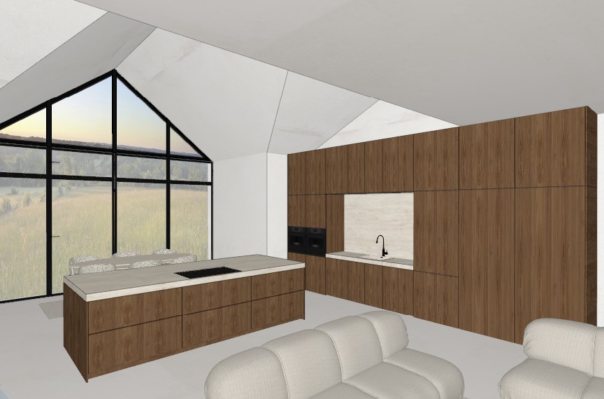 a modern and spacious kitchen interior with high vaulted ceilings featuring large triangular windows that offer stunning views of a serene dusk lit landscape the cabinetry is crafted from rich walnut wood adding warmth and elegance to the space a central island with a sleek beige stone countertop complements the minimalist design the flooring is a glossy light gray reflecting the ambient light comfortable plush taupe sofas sit invitingly in the open area enhancing the cozy atmosphere natural sunshine streams through the windows casting soft shadows and creating a tranquil inviting atmosphere warm neutral and earth tones dominate emphasizing a blend of modern elegance and natural beauty