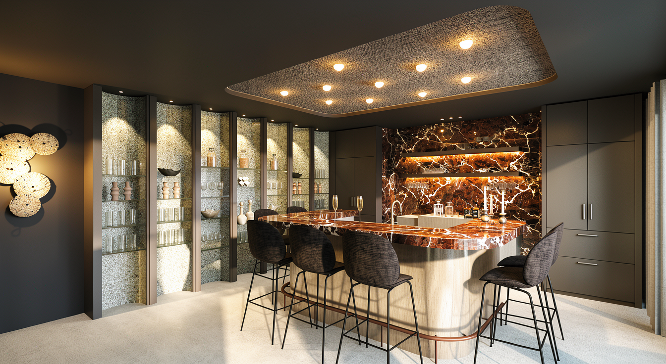 make it look photorealistic cieling is dark concrete with industrial style visible comunnications put some intensive artificial spotlights falling from the cieling on chairs and desk in the front the space is light and well illuminated add two standing people around the table