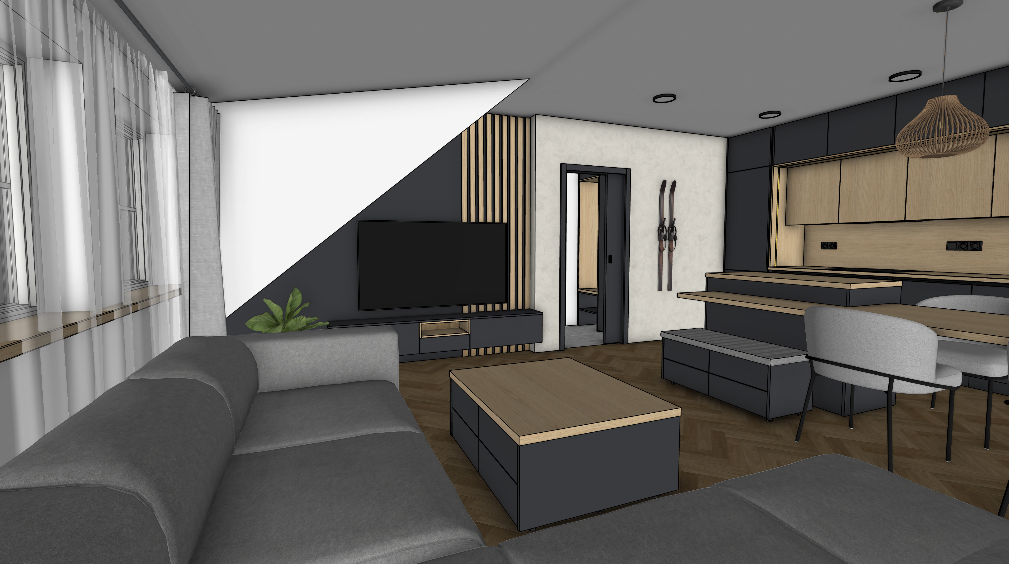 photorealistic render of the uploaded sketchup kitchen image preserve exact camera angle and all original textures materials no redesign add realistic ceiling lights and sunny daylight from outside with global illumination and natural shadows ultra realistic architectural photo ray traced 8k