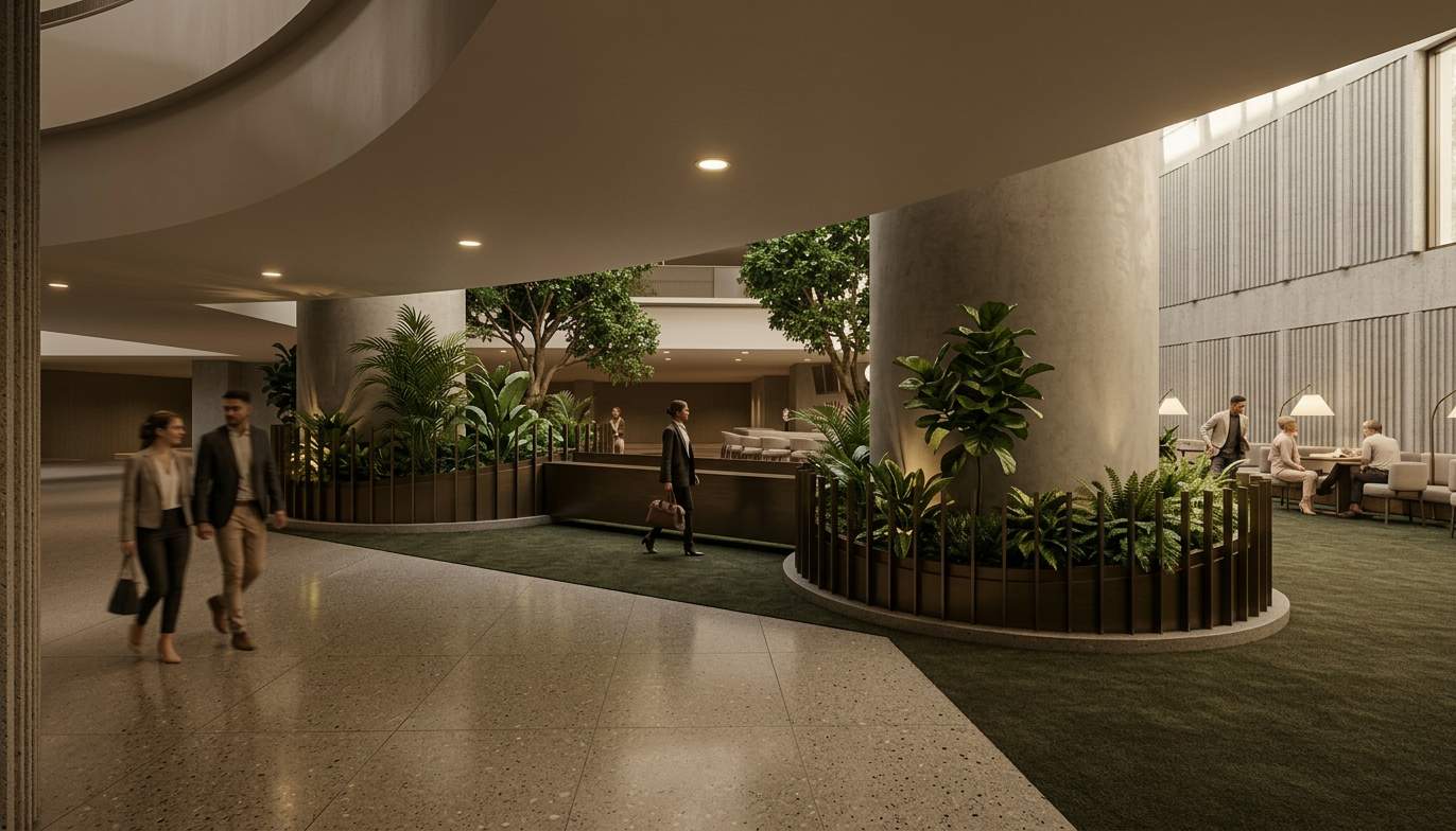 maintain materials proportion and architecture of input image make image feel more like a john portman hotel lobby