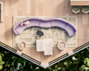 create a photorealistic 3d interior perspective render of a modern living room with a strong sense of depth and space main focus a curved modular sectional sofa forming a soft semi circle sofa in soft neutral or pastel tones beige blush or light lavender the sofa should be the visual anchor of the scene secondary elements a minimal coffee table setup one light oak wood block table one low upholstered ottoman in beige keep these subtle and secondary in importance architecture floor to ceiling angled glass walls windows open view to greenery outside trees soft blurred landscape materials light natural oak wood flooring soft textured fabric on sofa and ottoman subtle woven area rug under seating matte wood finishes lighting strong natural daylight entering from windows soft shadows and highlights across the curved sofa realistic light bounce and reflections camera eye level or slightly elevated 3d perspective not top down positioned to capture depth see sofa curve table window view slight wide angle lens natural not distorted atmosphere bright airy calm minimal styling clean composition style modern soft luxury neutral palette with warm tones rendering quality ultra realistic high detail textures fabric wood grain soft cinematic lighting