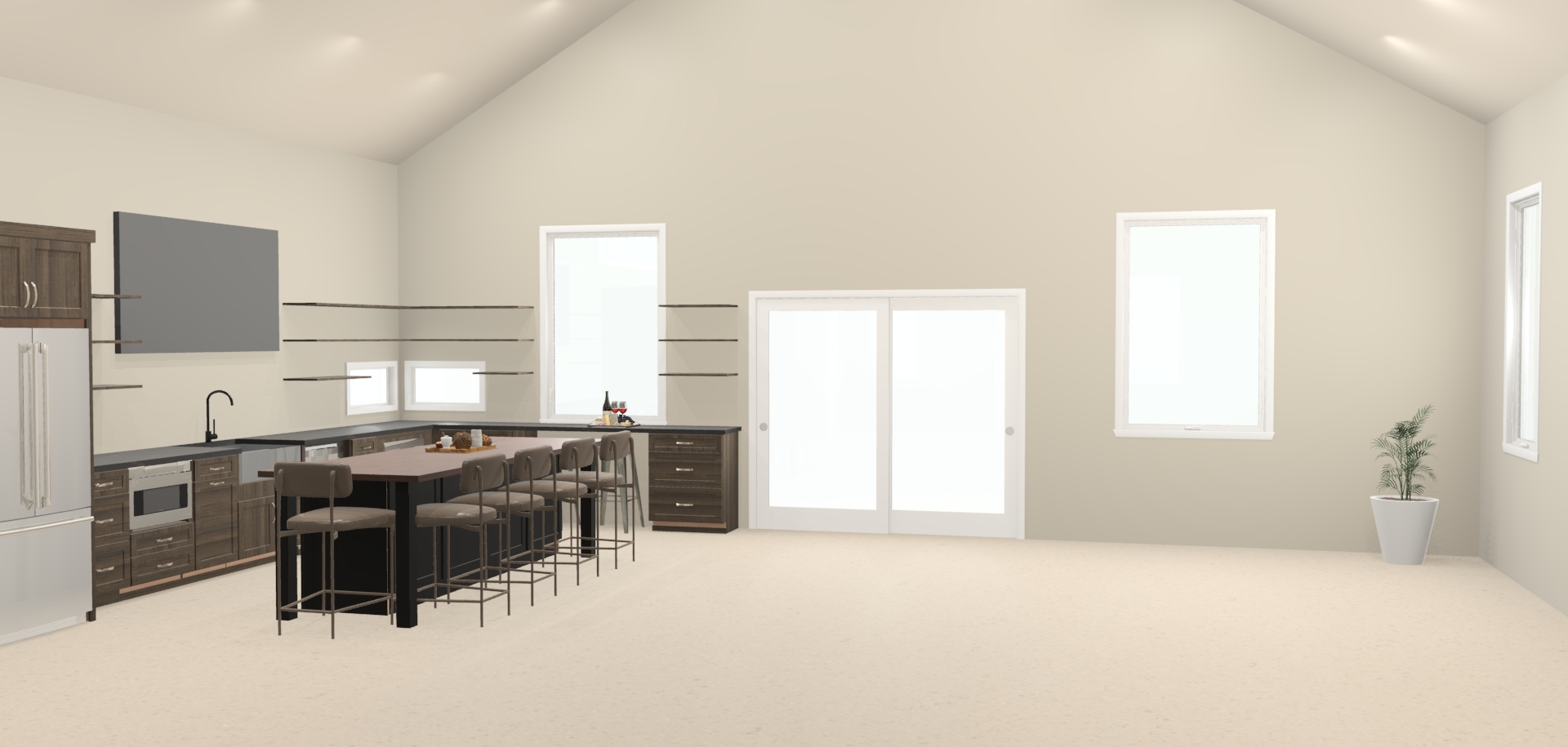 stage this to feel rustic modern with a dining table and chairs to the right with area rug under the table add a neutral stone backsplash to the kitchen add black brackets to the wall shelves stage wall shelves with dinnerware drinkware and decor change ceiling to a dark metal with wood beams leave all windows and door in the same location