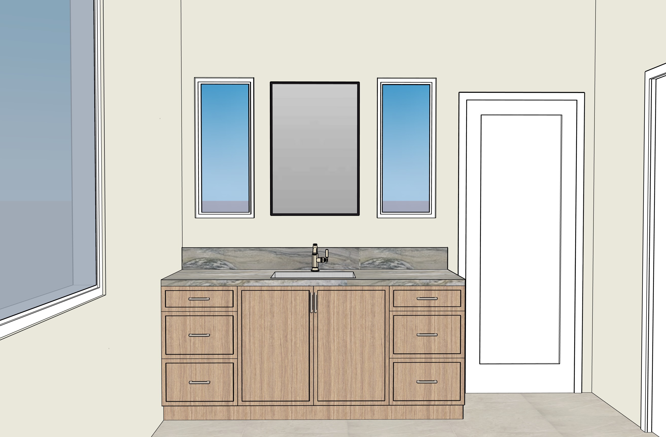 can you do a photorealistic rendering of this image while maintaining original geometry and materials keeping the angle of the room the same as whats in the image do not zoom in and add trees in the background of windows and keep the flooring color as is add natural sunlight