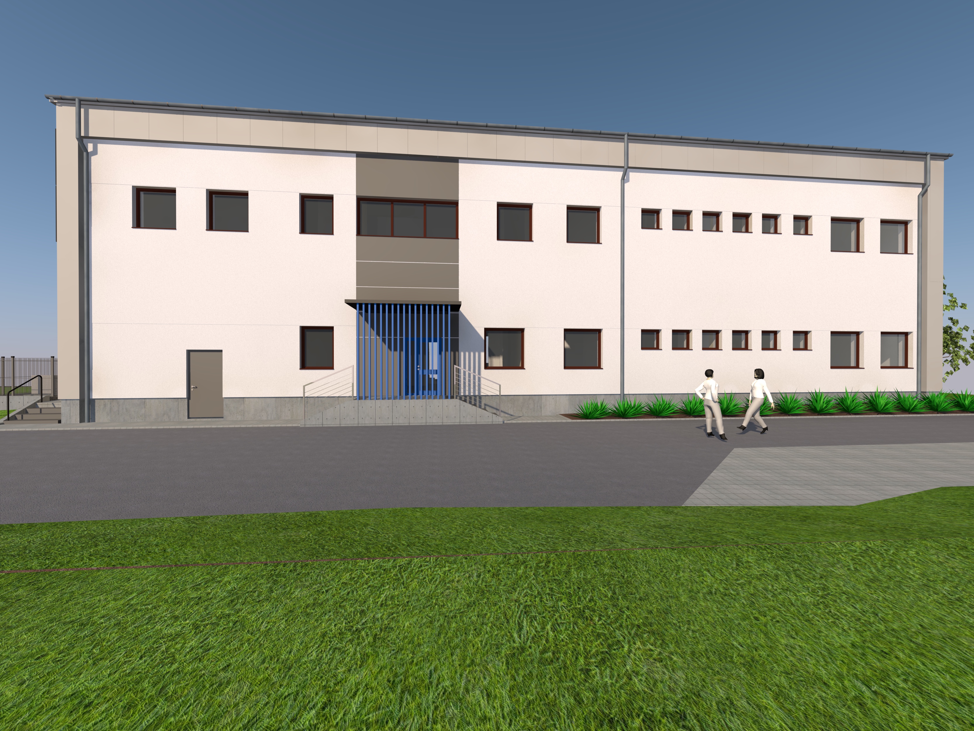 exterior shot white silver and graphite facade blue roof elements blue and graphite doors nice paving slabs black asphalt two ladies in suits architecture