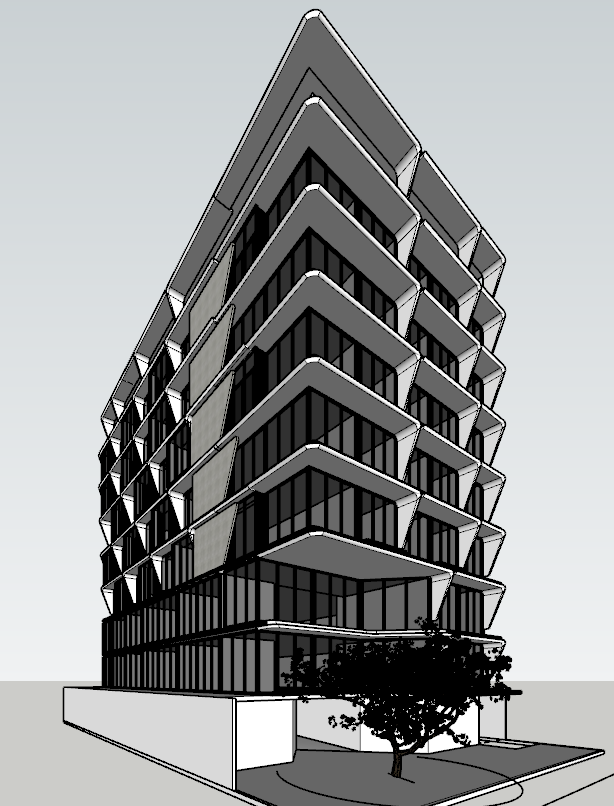 render a modernist architectural building with sleek angular lines use a palette of light gray for the concrete deep charcoal for the window frames and reflective glass the building should stand in an urban landscape with a clear blue sky and warm sunlight to create a bright and inviting atmosphere add subtle shadows for depth and dimension highlighting the building s geometric design