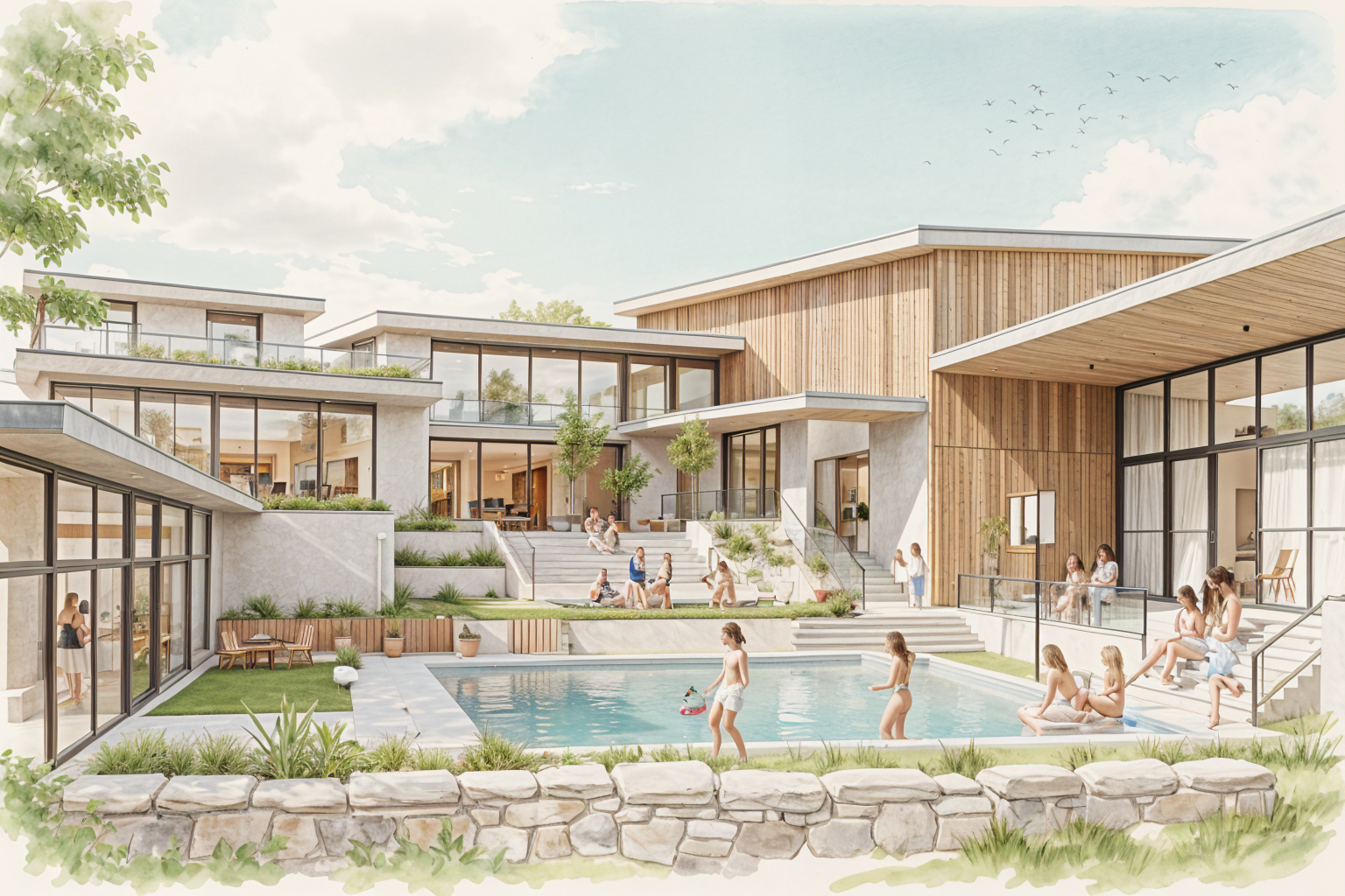 render this image as a contemporary architectural competition illustration with clean sketch like linework use precise but slightly loose ink outlines to define geometry and edges maintaining accurate perspective apply minimal controlled color with soft neutral tones light greys warm whites muted greens pale wood tones reduce watercolor effects keep fills subtle flat or lightly textured rather than painterly introduce gentle shading and ambient occlusion to give depth without photorealism use soft diffuse daylight with balanced contrast and no harsh shadows simplify materials while preserving architectural clarity and hierarchy render vegetation in a clean stylized manner with restrained detail include human figures as minimal elegant silhouettes or lightly detailed sketches to convey scale and activity maintain a refined diagrammatic aesthetic suitable for an architecture competition board avoid heavy textures excessive grain or painterly effects