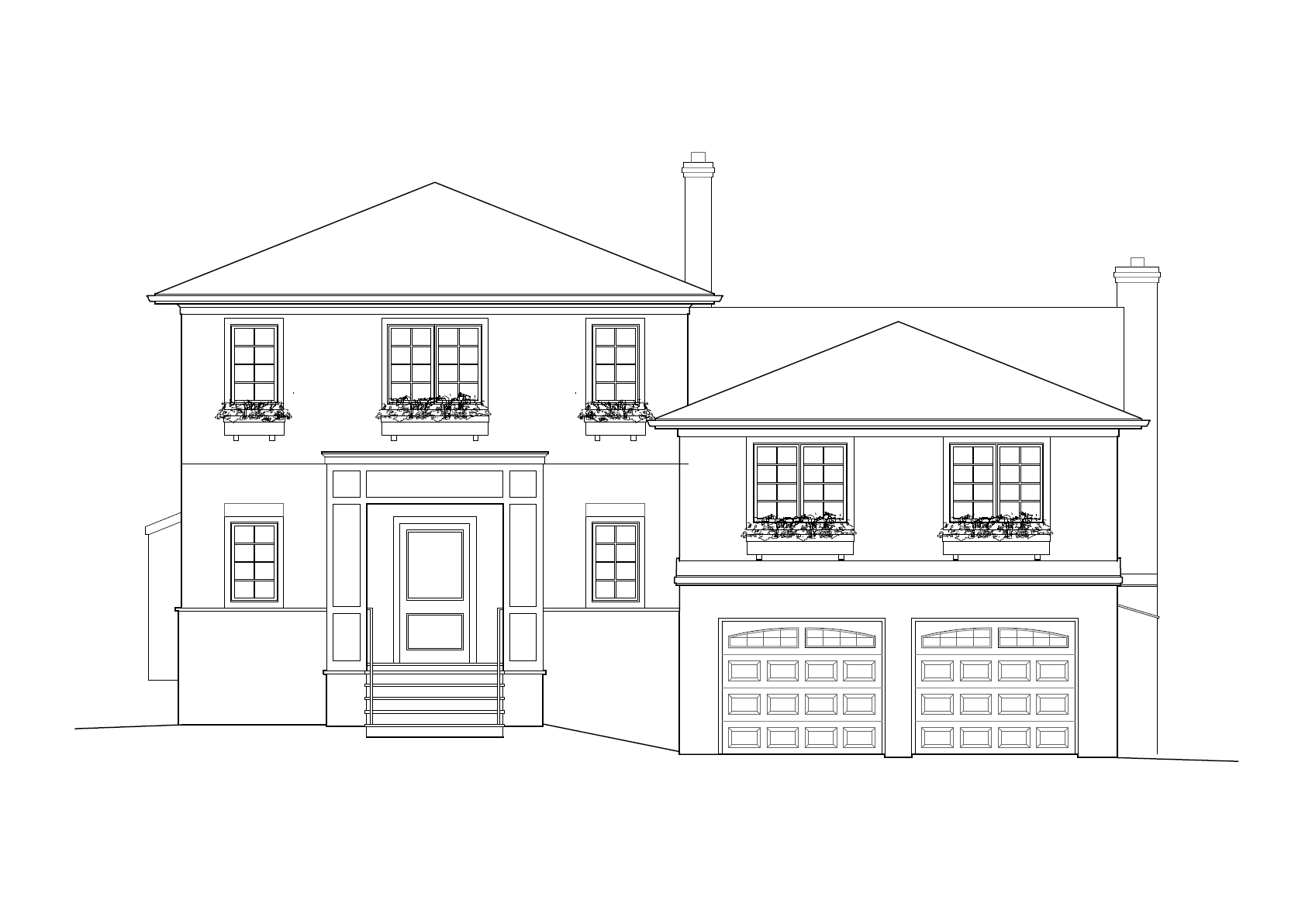 design a new two story addition on the left side of this split level home the addition should align with front garage wall the main entrance is to be recessed about 5 0 with decorative raised panels painted white and should be centered on the new addition the front door should be 42 inches wide and should be painted dark gray the style of home should be a simple english cottage with a dark gray slate color hip style shingle roof the chimney should be on left side of new addition and should be clad in brick to match the brick on the existing garage the balance of the house should be clad with a fine finish white stucco with a warm gray stone watertable all the windows should be white casement units add some english charm and details