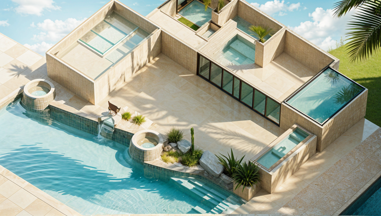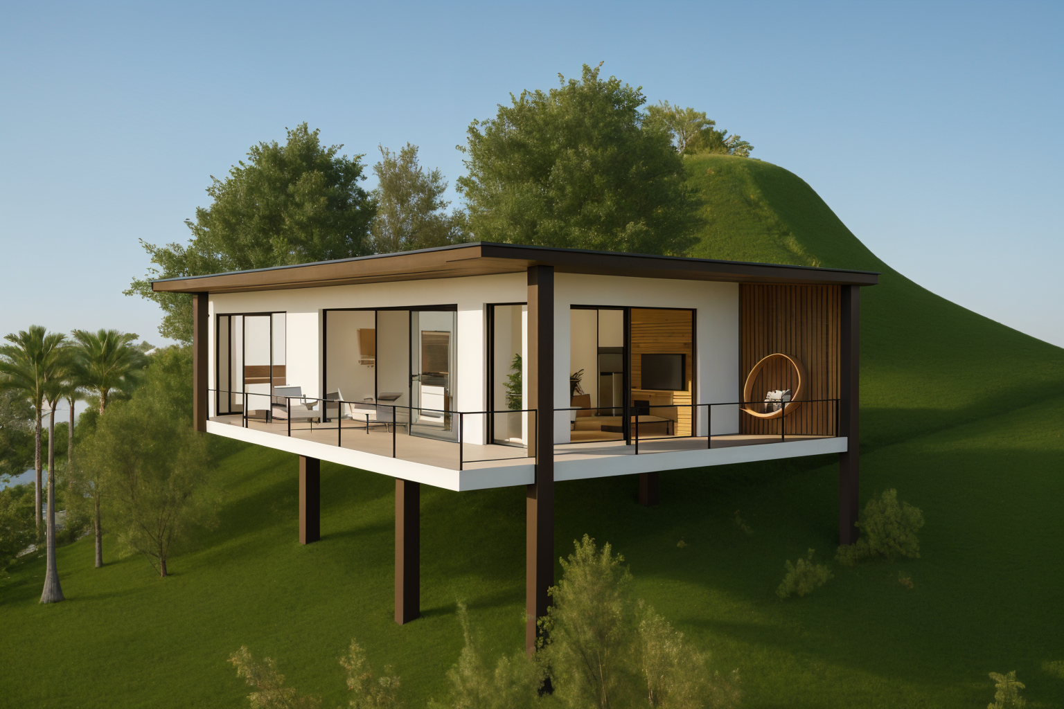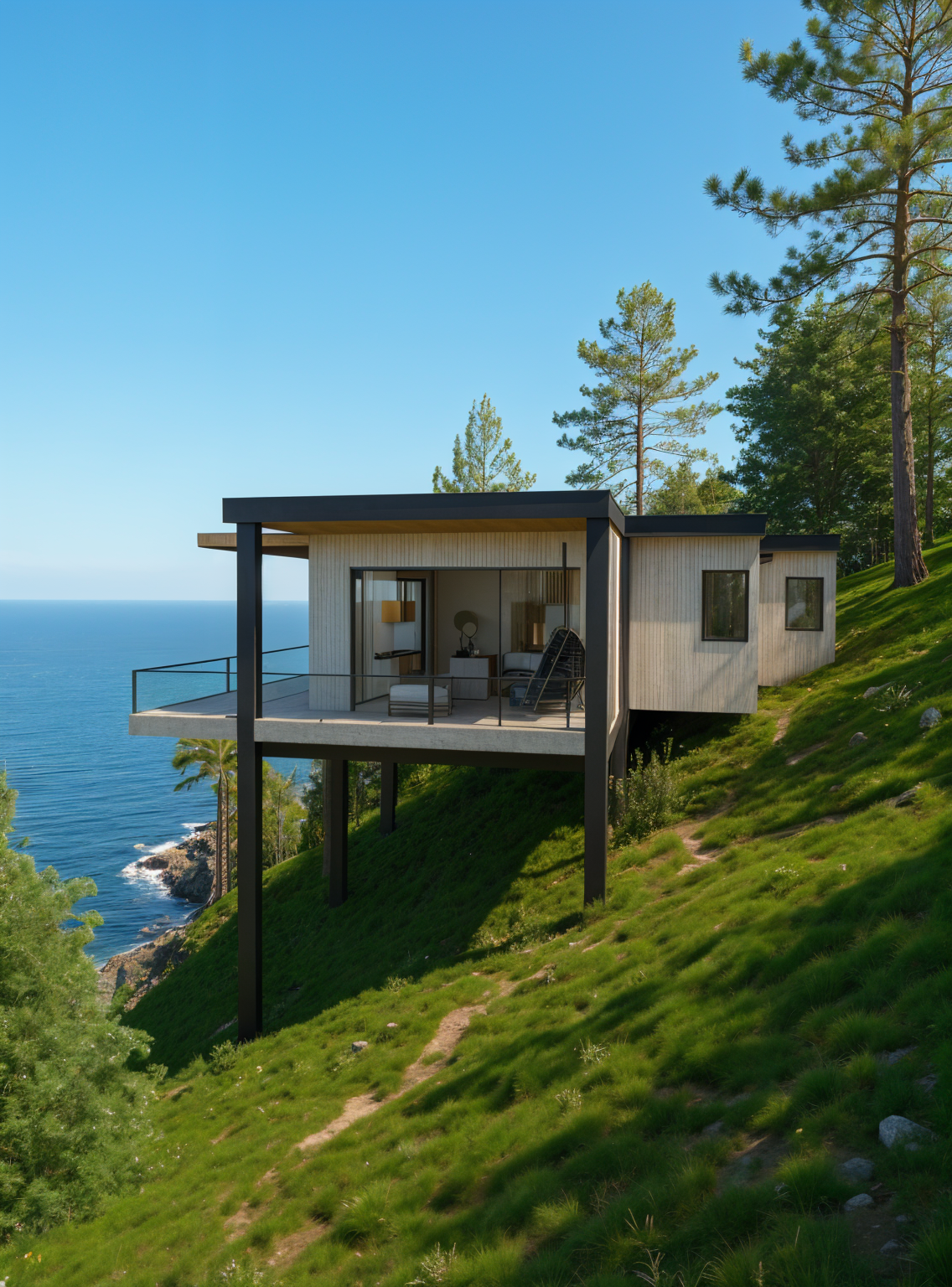three story modernist house with minimalist design featuring sleek gray tones emphasize clean lines with a matte charcoal gray facade and a soft light gray texture for the main walls large glass windows and balconies act as focal points highlighted by transparent glass railings the garage doors and main door are colored in a deep black add a lush green lawn surrounding the house and a light gray tiled driveway the sky is clear a bright blue creating a serene and contemporary atmosphere