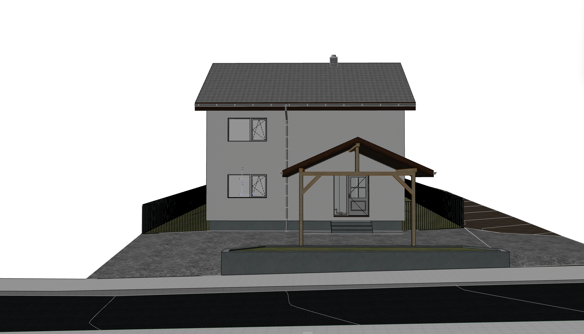 a modern two story house with a gabled roof painted in soft light gray with dark gray accents the front porch features a wooden pergola stained in rich mahogany the concrete pathway and driveway are a smooth subtle charcoal gray while the surrounding fences are dark wood lush green hedges line the perimeter adding a touch of nature the sky is bright blue with a few fluffy white clouds creating a serene and inviting atmosphere