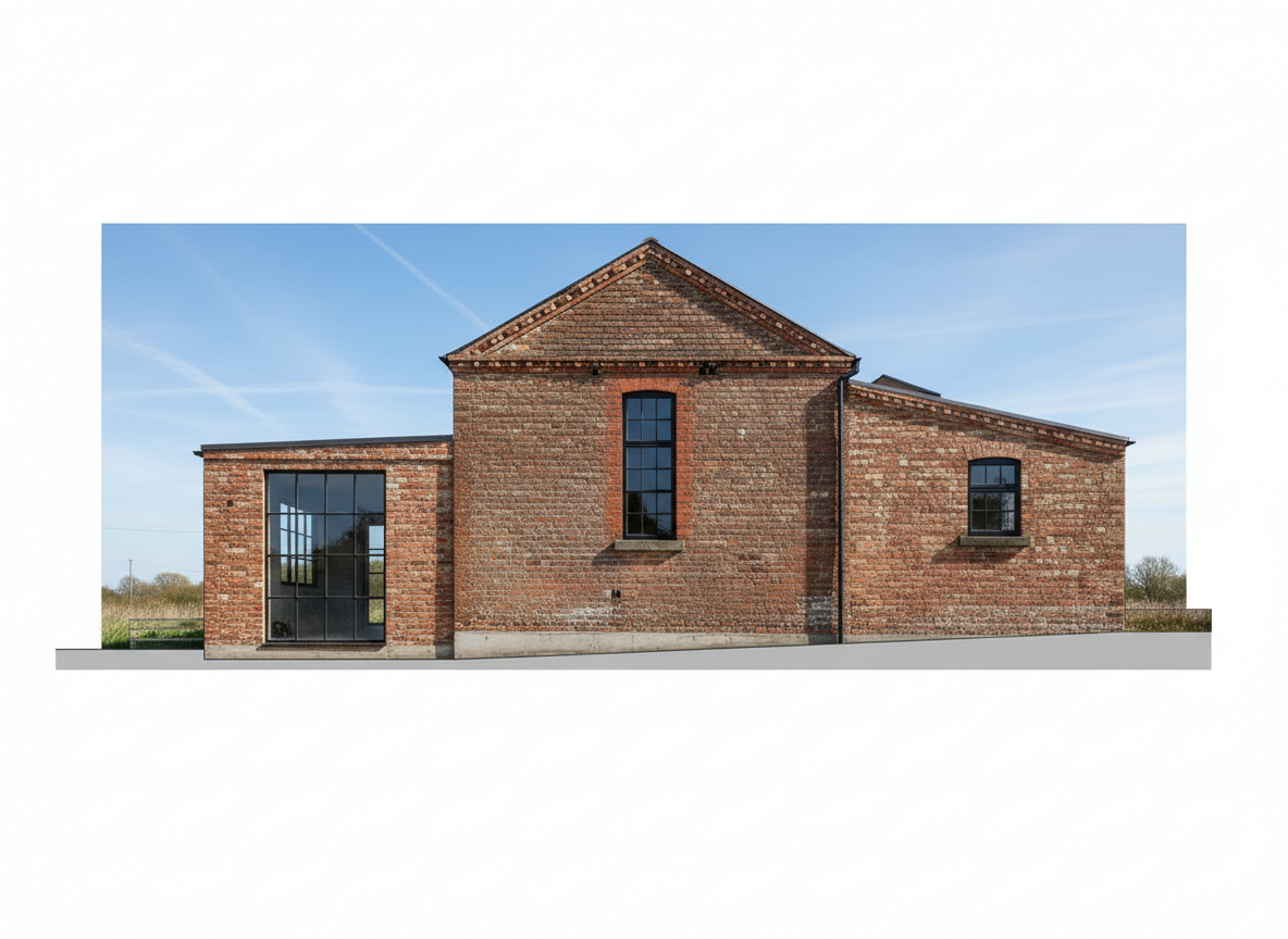 exterior shot building shape and window proportions to be remain the same as the source image do not add any extra windows or doors
