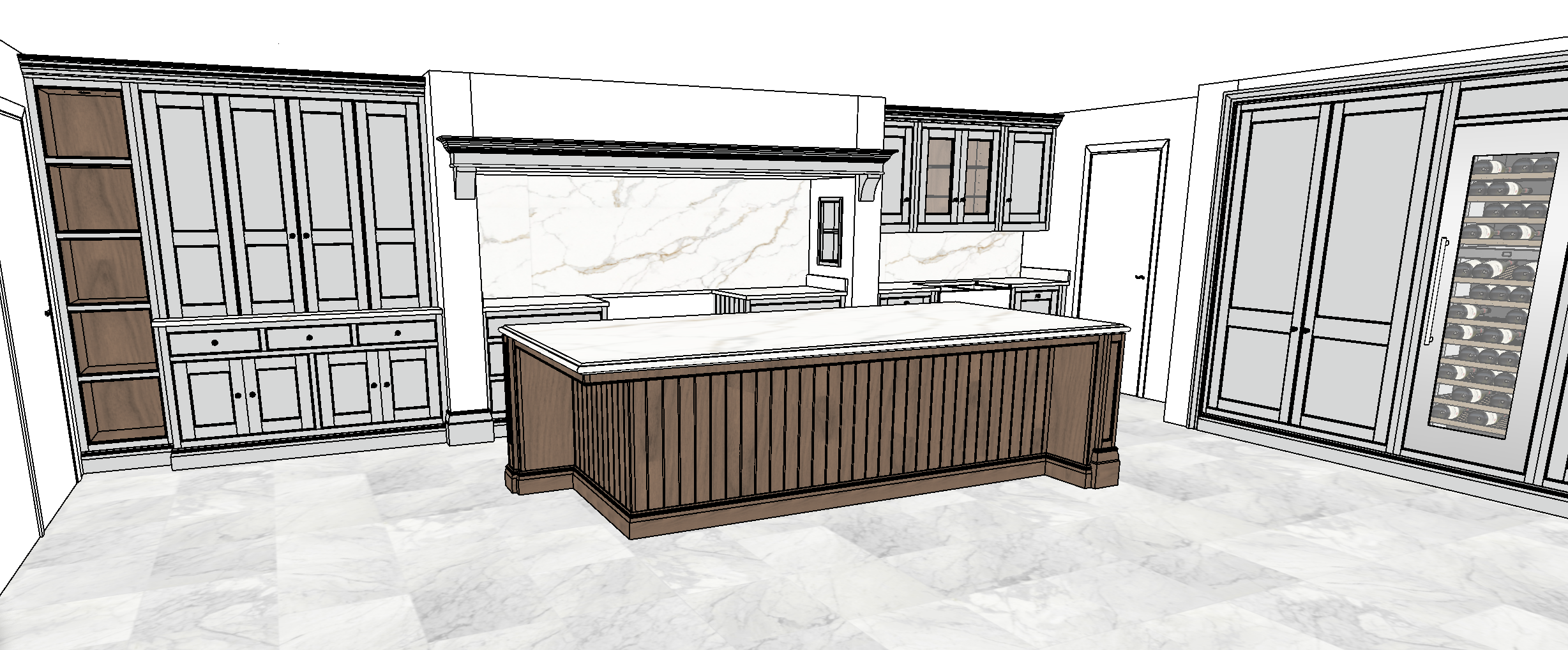 maintain all details realistic render off white cabinetry with dark oak island show luxury brass stools in an l shape under the kneespace and pendant lights above the island with limestone floor add kitchen accessories range cooker shown as lacanche with brass handles