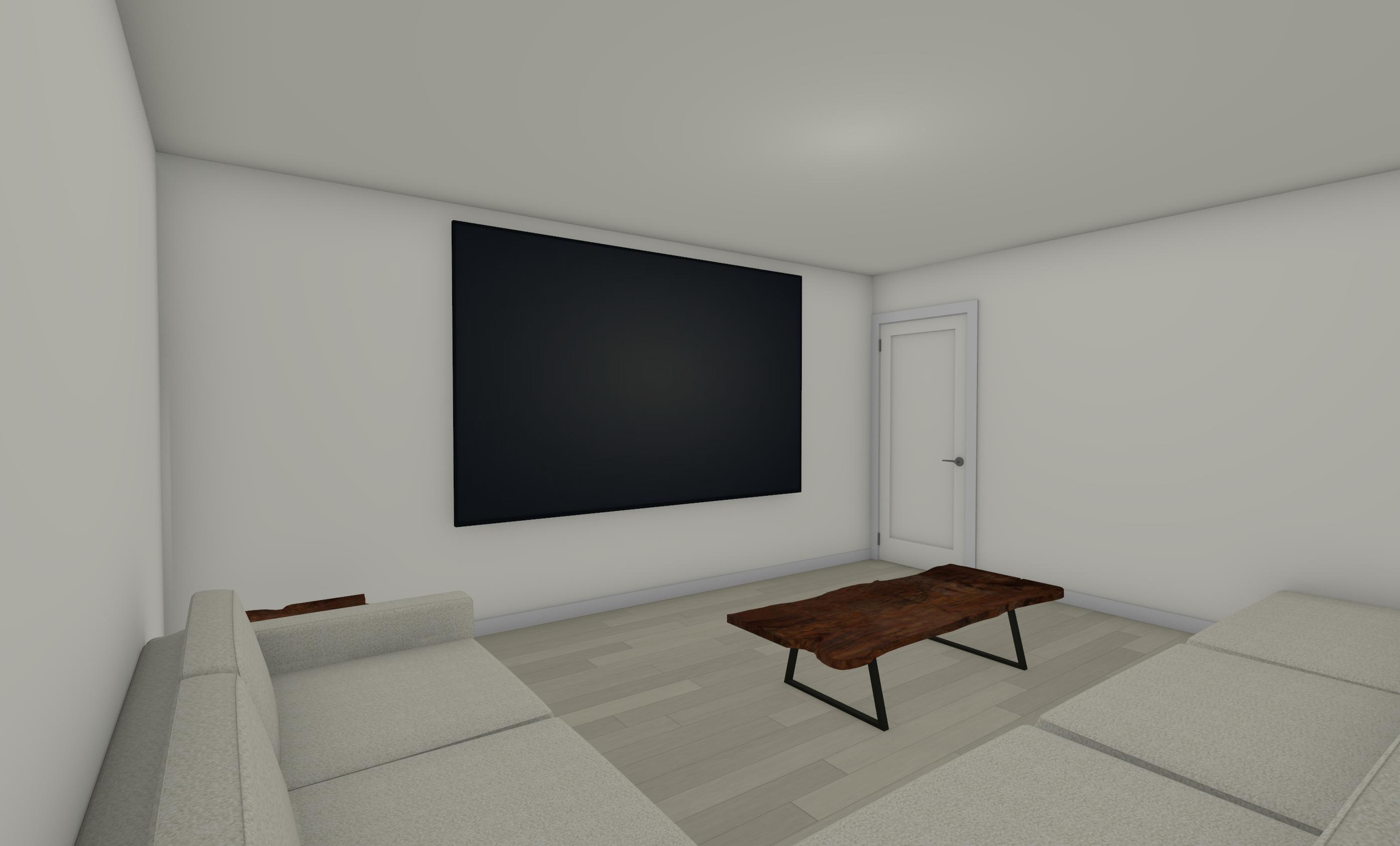 highest priority it s important to keep the sizes of everything the same change textures and materials but keep the sizes of everything the same its important to keep to scale the person in the photo is 5 6 for scale use her for scale and remove her from rendering do not change size of windows or doors do not add doors or windows do not change or add fixtures add people the ceiling is 8 for reference add art to walls movie theater materials neutral color palette creamy whites warm taupes light wood tones wide plank oak flooring clean and minimal styling high end residential design soft ambient glow architectural visualization ultra realistic 8k detail