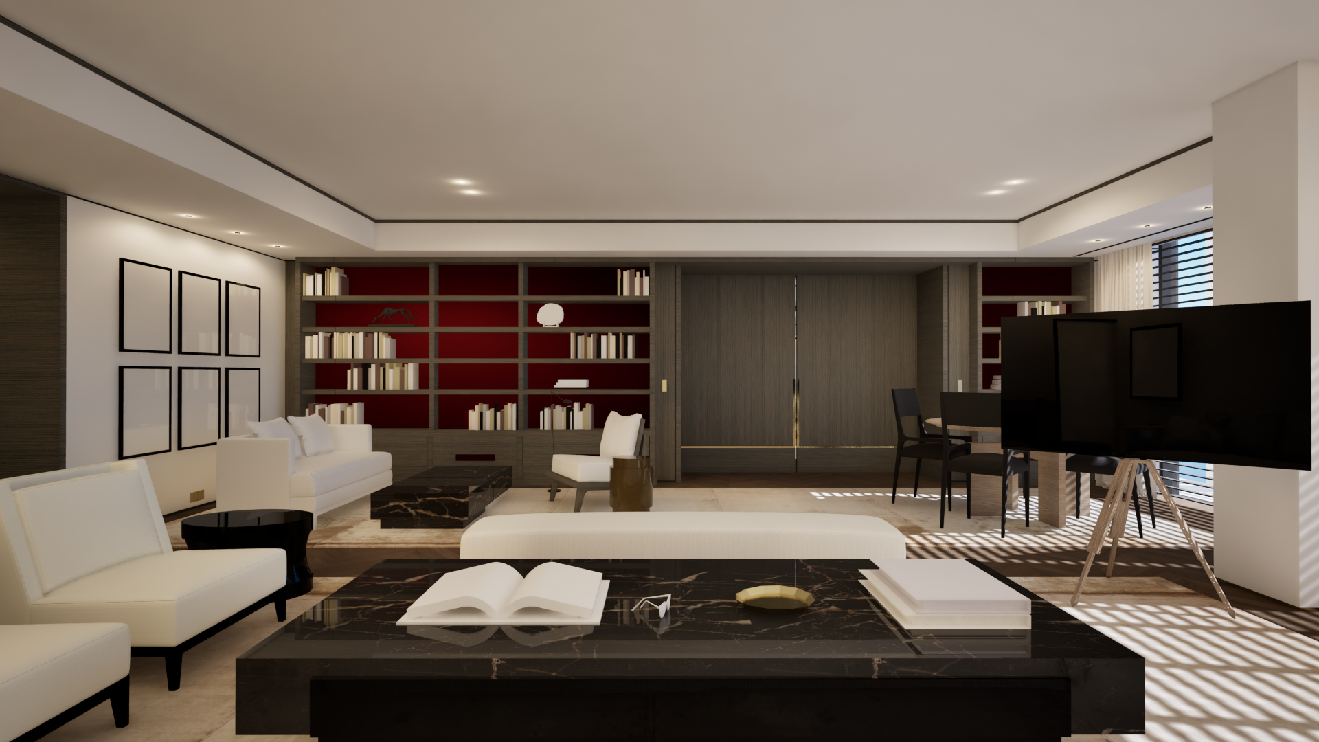 add a few more books to the bookshleves make the fabrics a bit better do not change anything about the colours or composition of the image make the lighting a bit better add black and white abstract pictures on the frames